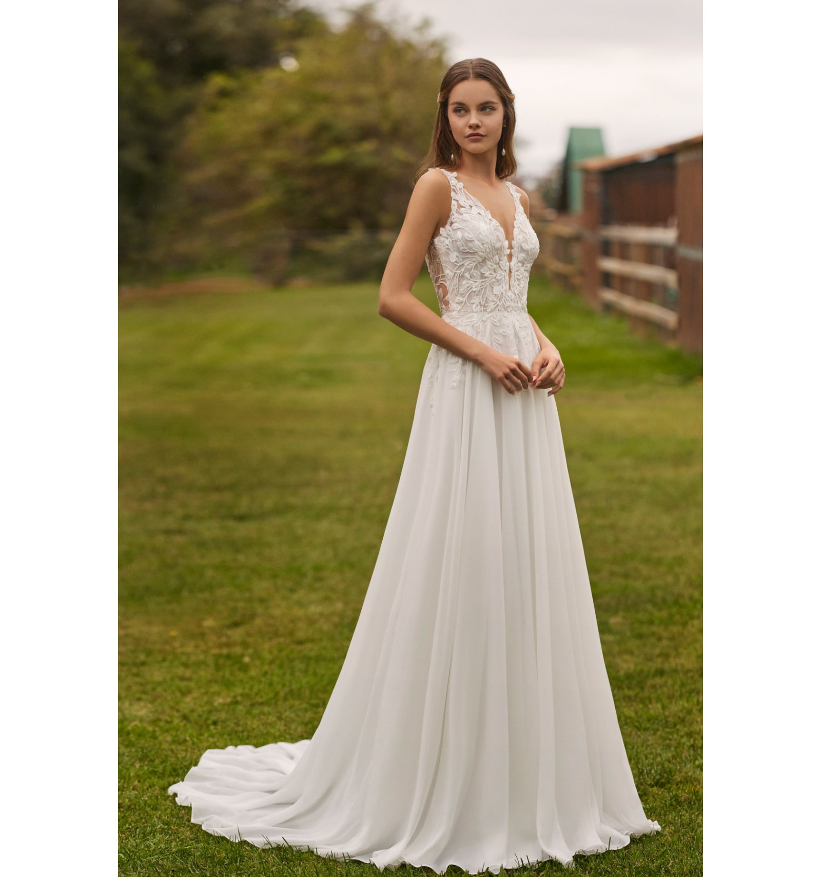 Please note that the item sold is a pre-owned or end-of-collection wedding dress. It may show slight differences from the model shown in the photos. Choosing your dress from our wedding dress consignment store is a step towards an eco-friendly wedding.