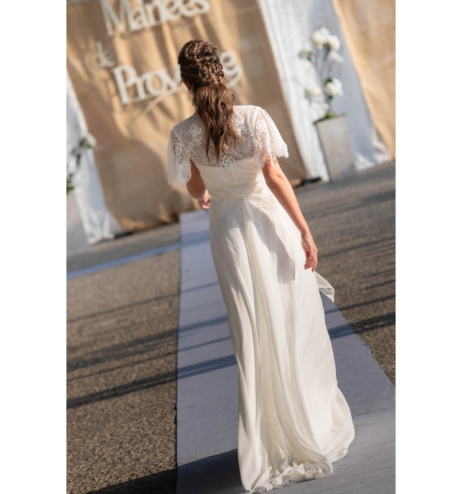 The Ambre gown by Mariées de Provence is a creation filled with softness and romance, perfect for the bride seeking elegance and lightness. Crafted from flowing chiffon, it charms with its airy silhouette and natural drape. Its delicately embroidered lace bodice beautifully enhances the bust with finesse. The ethereal skirt moves gracefully with every step, creating a poetic and timeless look.