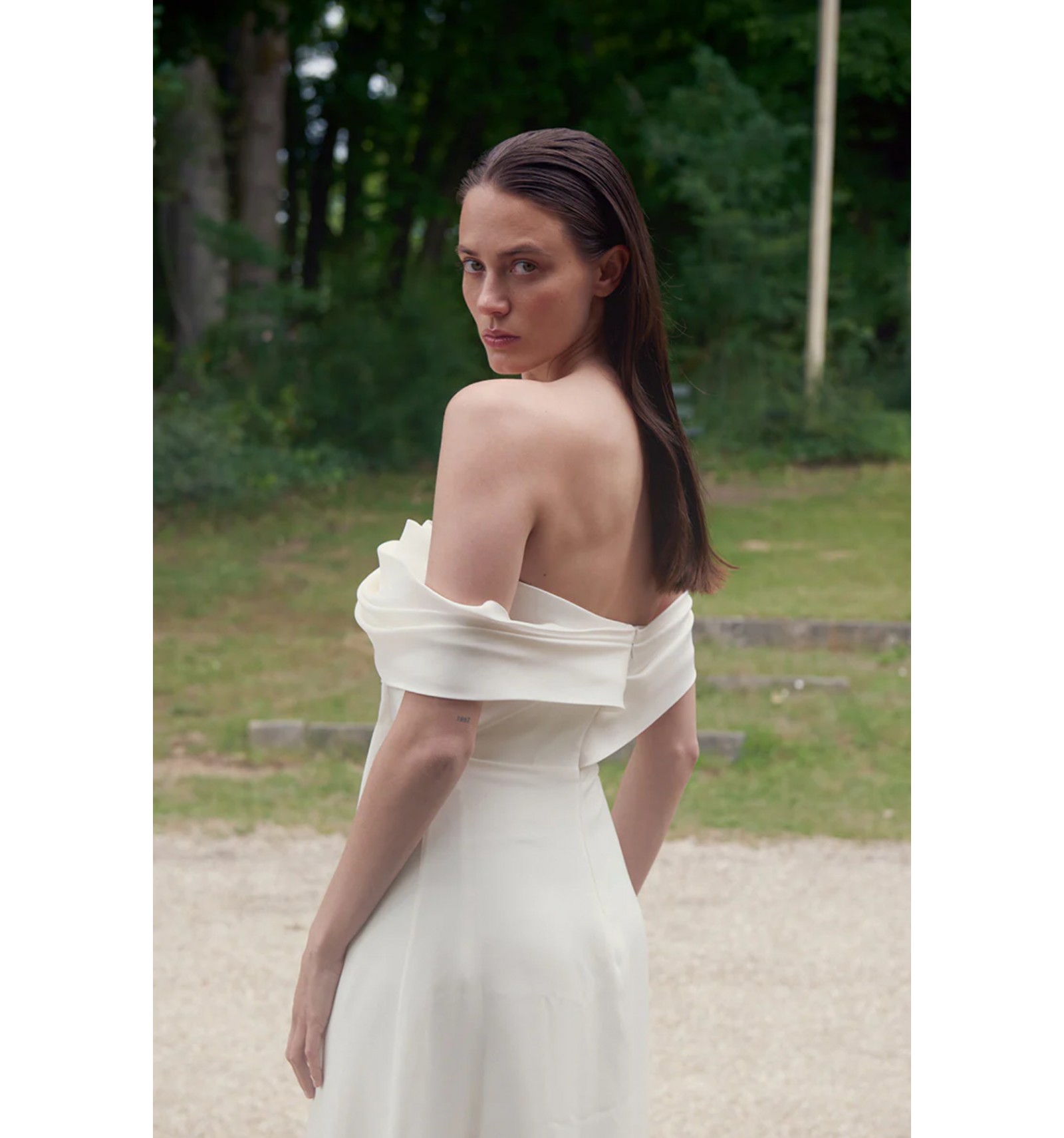 The Vérone gown by Laure de Sagazan reveals a silhouette of pure elegance, blending soft modernity with timeless refinement. Its draped, cross-over bodice creates a sculptural effect while gracefully showcasing the shoulders. The delicate off-the-shoulder sleeves add a subtle sensuality without compromising the gown’s understated aesthetic. The long crepe skirt, fluid and minimal, moves with natural, effortless grace.
