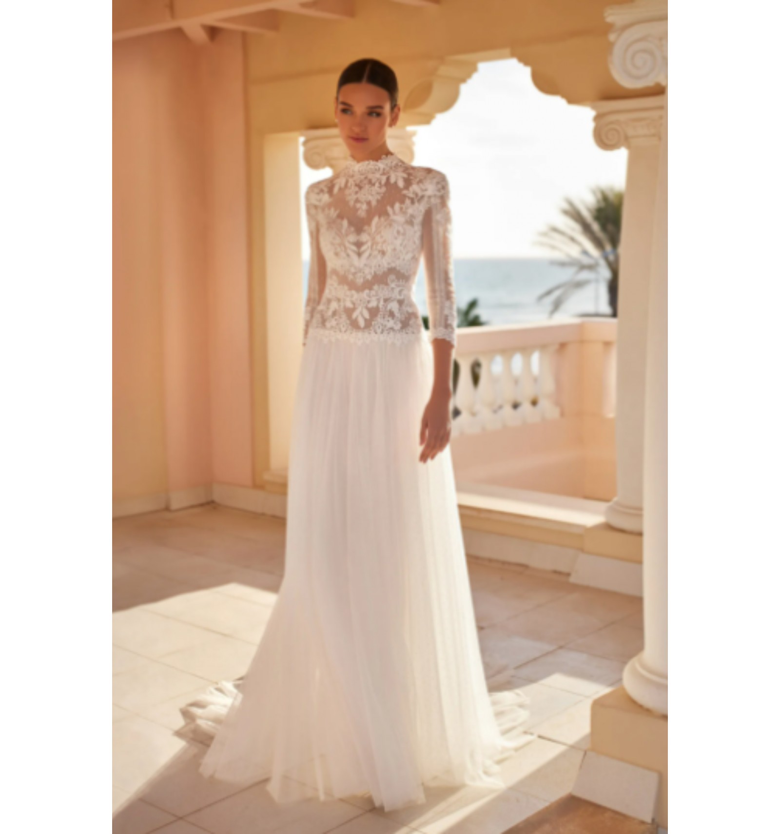 This dress features a refined lace bodice with a high neck and three-quarter sleeves, offering an elegant and sophisticated look. Delicate floral motifs adorn the bodice with exquisite finesse. The lightweight tulle skirt flows gracefully, creating an airy and romantic movement. The overall effect is a majestic silhouette, perfect for a modern bride with a timeless style.