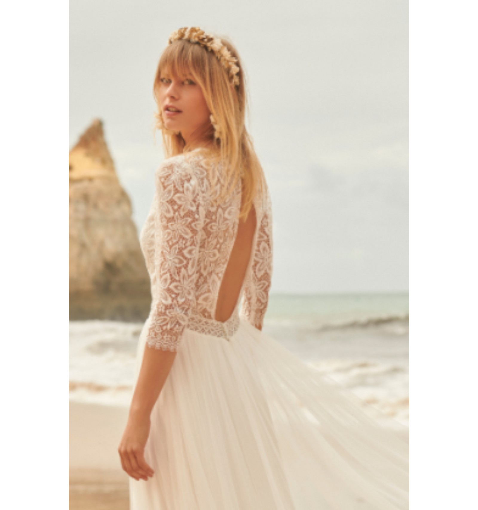 The Ilena dress features a delicate floral lace bodice with three-quarter sleeves, lending a bohemian and refined touch. Its deep V-neckline elongates the silhouette while remaining elegant thanks to the fine details of the pattern. The waist is beautifully defined by an openwork belt that structures the overall look. The airy tulle skirt offers light and natural movement, perfect for a free-spirited and romantic bride.