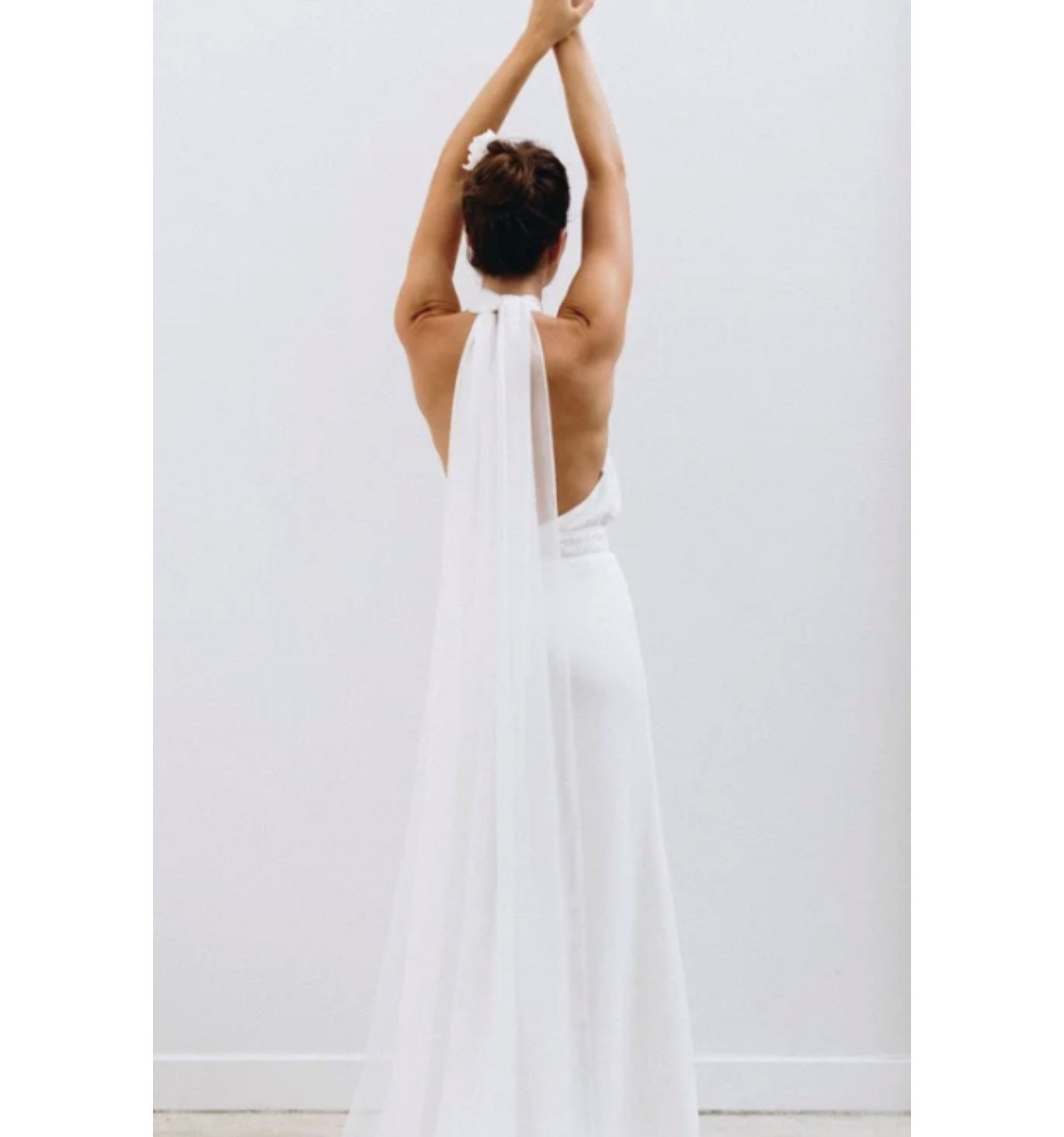 Anne de Lafforest's Arona gown features an elegant halter neckline tied at the neck, subtly revealing the shoulders. The fluid fabric falls naturally, creating a light and modern drape. The waist is accentuated by a wide belt embroidered with delicate motifs, adding texture and refinement. The overall effect is minimalist, contemporary, and undeniably chic.