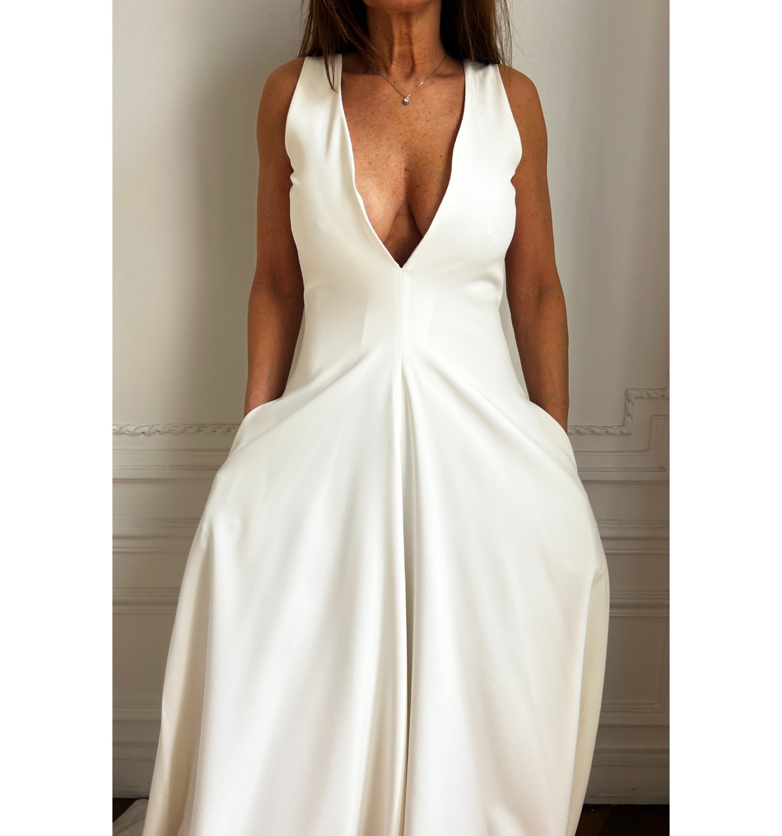 This Victoire Vermeulen gown is a long ivory dress with a clean and decidedly modern style. It is distinguished by its very deep V-neck and wide straps that elegantly structure the bust. The cut is fitted at the top and then flows gracefully into the skirt, subtly highlighting the silhouette. The smooth fabric and impeccable drape give it a refined, timeless, and sophisticated look.