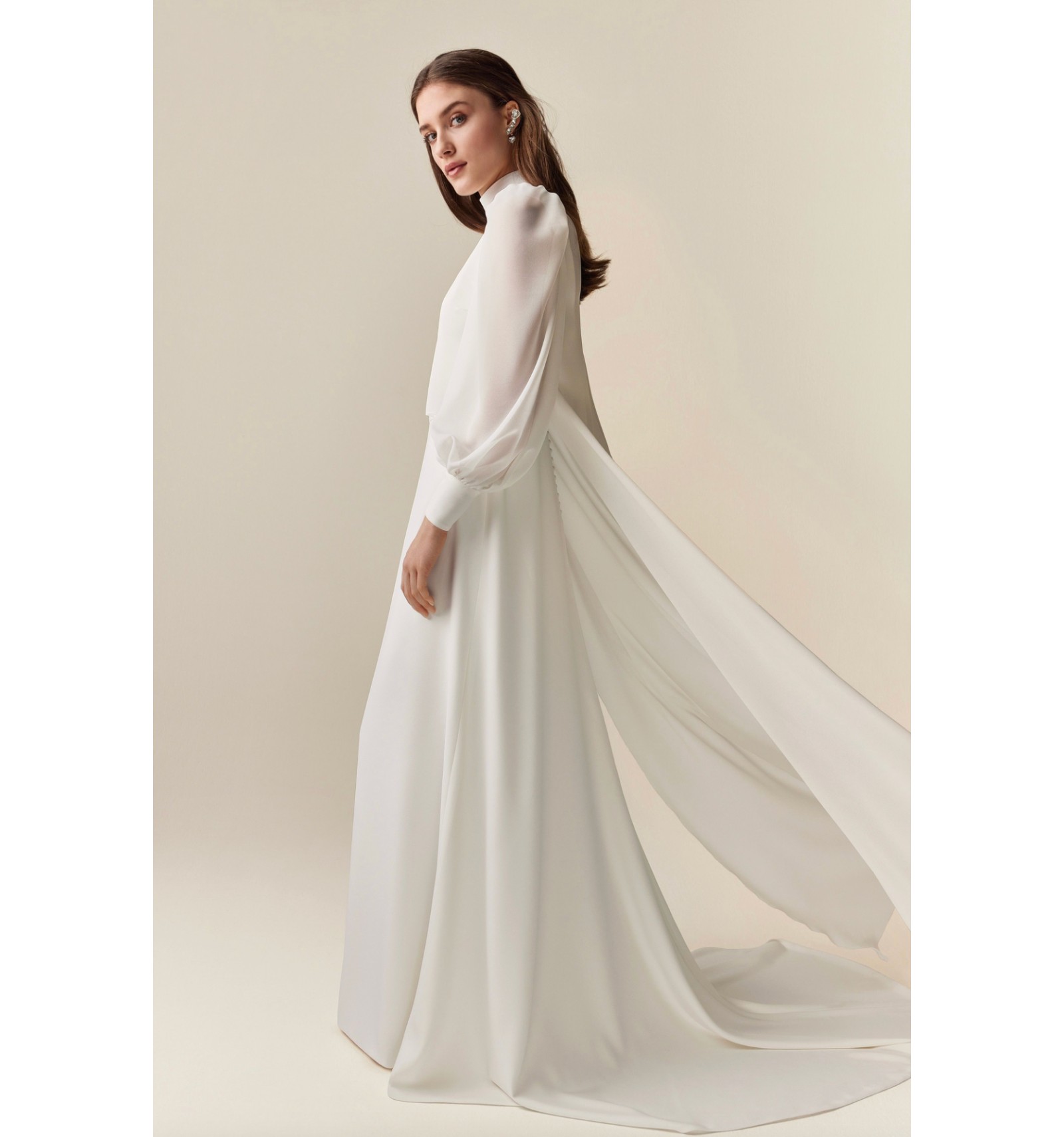 Wedding dress by Jesús Peiró featuring an elegant and contemporary design. The 2566 gown stands out for its clean lines and structured silhouette, creating a look that is both modern and timeless. A refined piece, perfect for a bride seeking understated elegance.