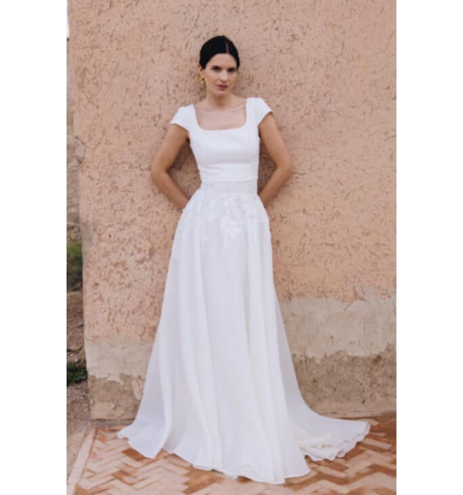 Anne de Lafforest's Jagger top is a very clean and structured bridal top that emphasizes the purity of its lines rather than embellishment. It features a graphic, square neckline with slightly covering short sleeves that beautifully balance the shoulders. The cut is fitted at the bust, highlighting the waist without stiffness, for a clean and elegant look. The overall effect is modern, chic, and timeless, perfect for a bride who appreciates sophisticated simplicity.