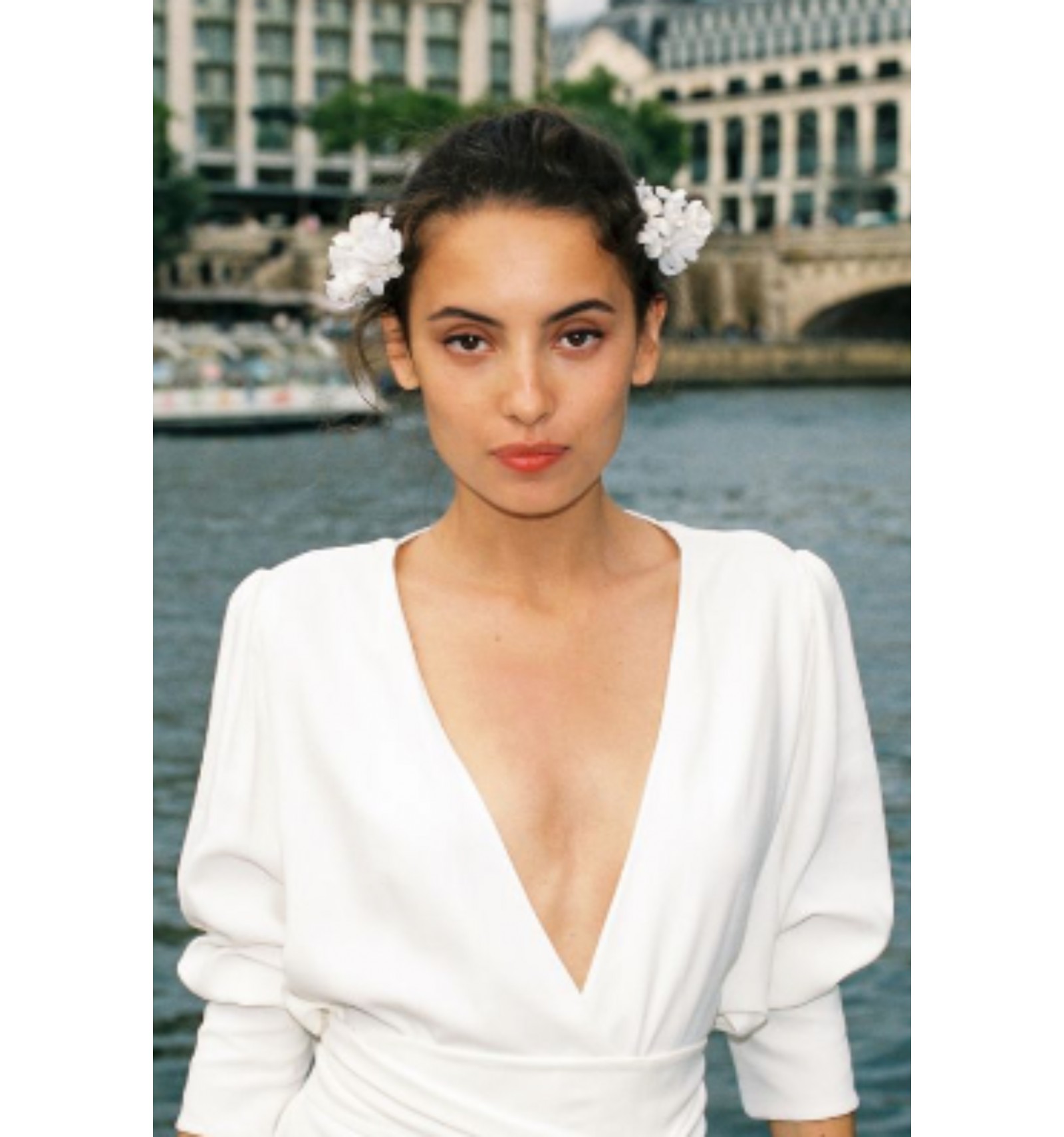Donatelle Godart's "L'eau à la bouche" dress is a bohemian and romantic wedding gown. It features a wrap-style silhouette inspired by the kimono, which accentuates the waist and creates a very feminine crossover neckline. Fluid and lightweight, it offers a natural and elegant look, typical of the free and modern spirit of the house's creations.