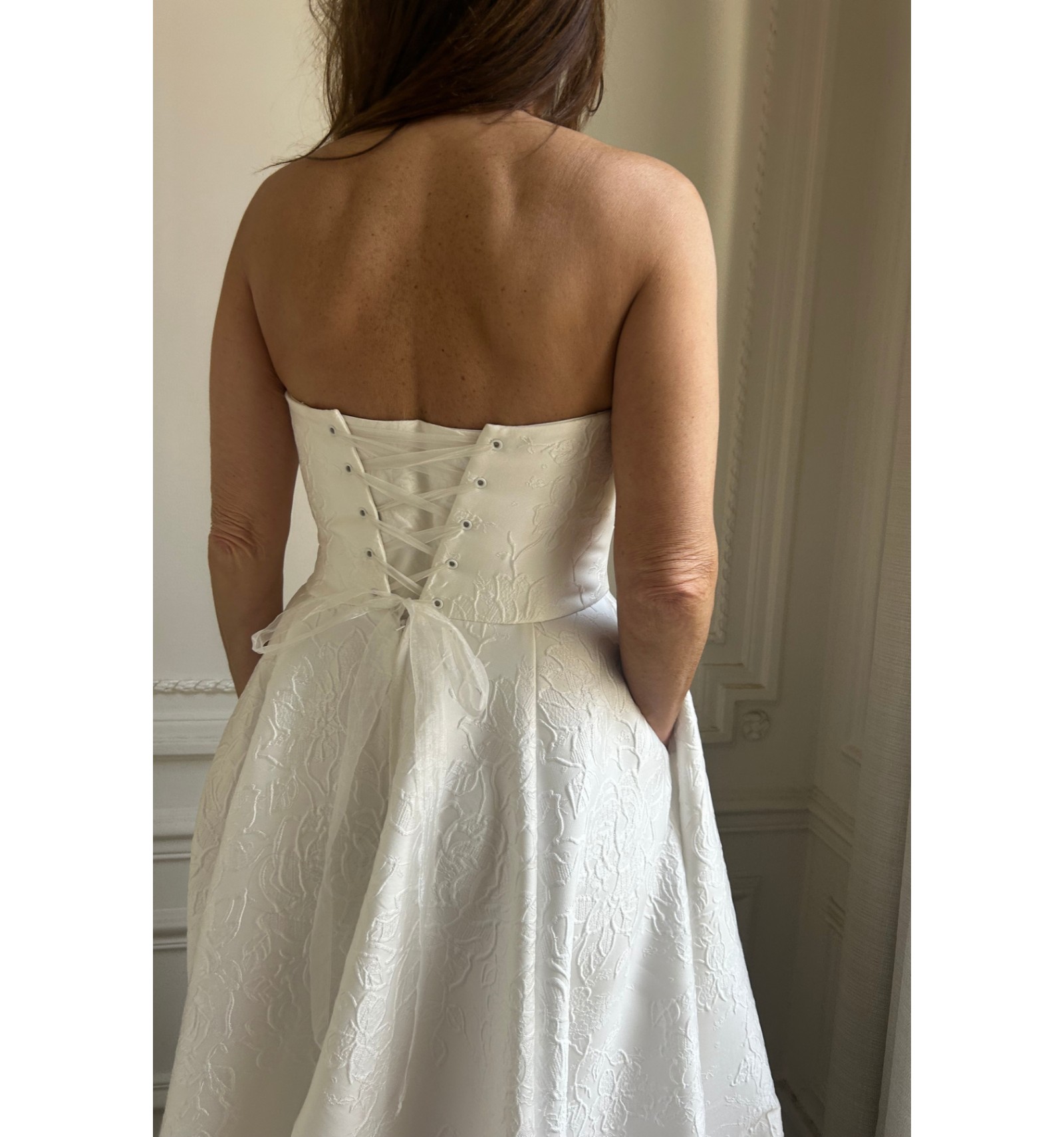 Please feel free to contact us to try on this dress in our wedding dress outlet in Paris, or for more information if you would like to purchase it online. You can have your wedding dress altered up to two sizes smaller by our seamstress.
