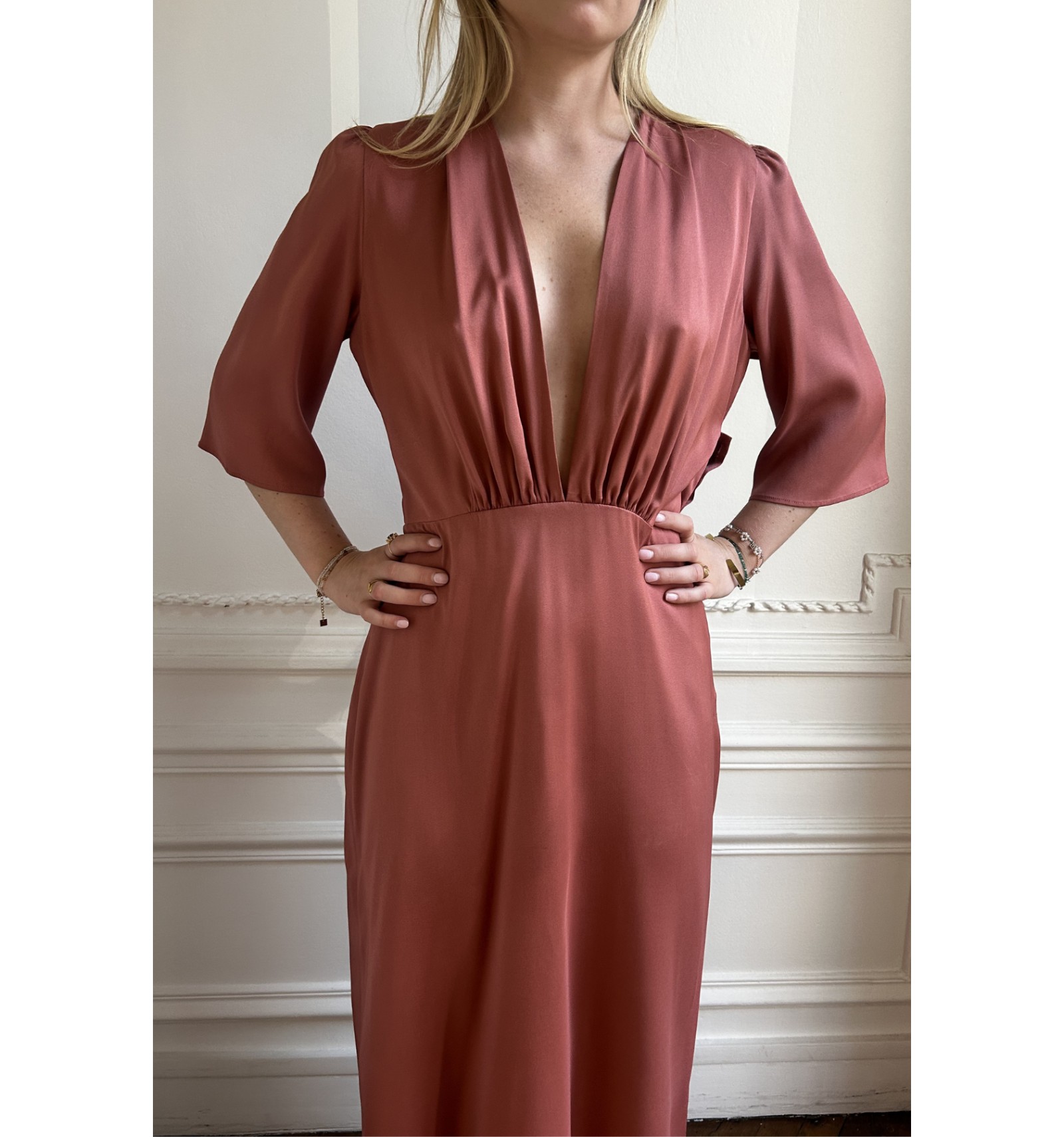 The Fontainebleau Dress is the perfect choice for your special occasions. Its plunging neckline and elegant midi cut enhance the silhouette with sophistication. The high neckline at the back adds a refined and modern touch.