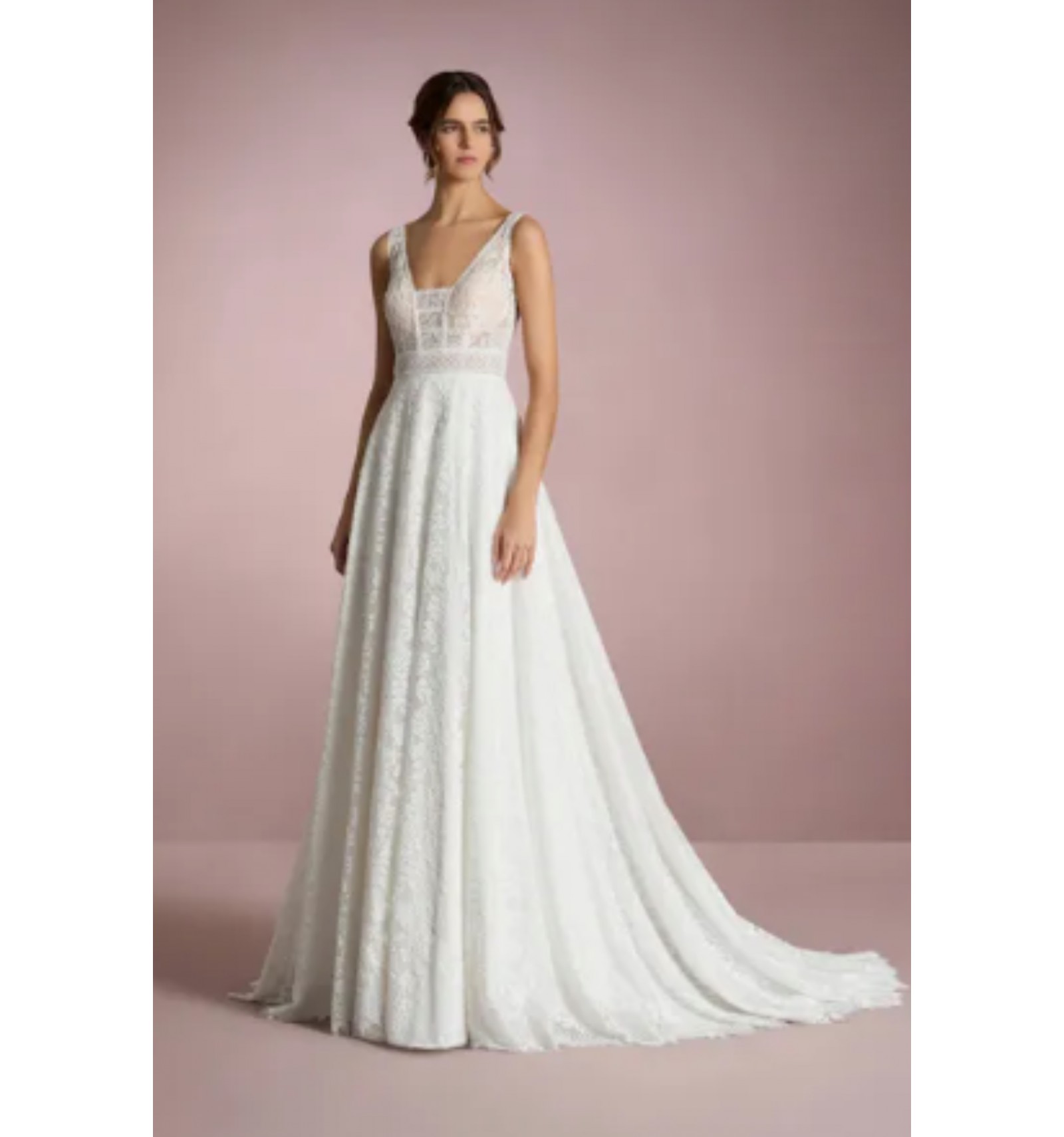 Please note that the item being sold is a pre-owned or discontinued wedding dress. This one can present some differences with the model presented in photo. Choosing your dress in our wedding dress consignment store is a gesture in favor of an eco-responsible wedding.