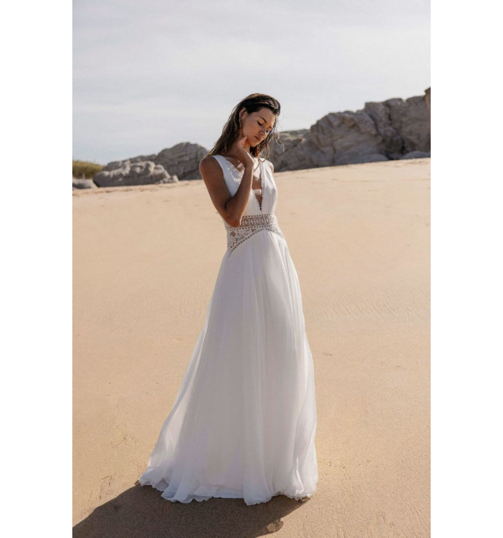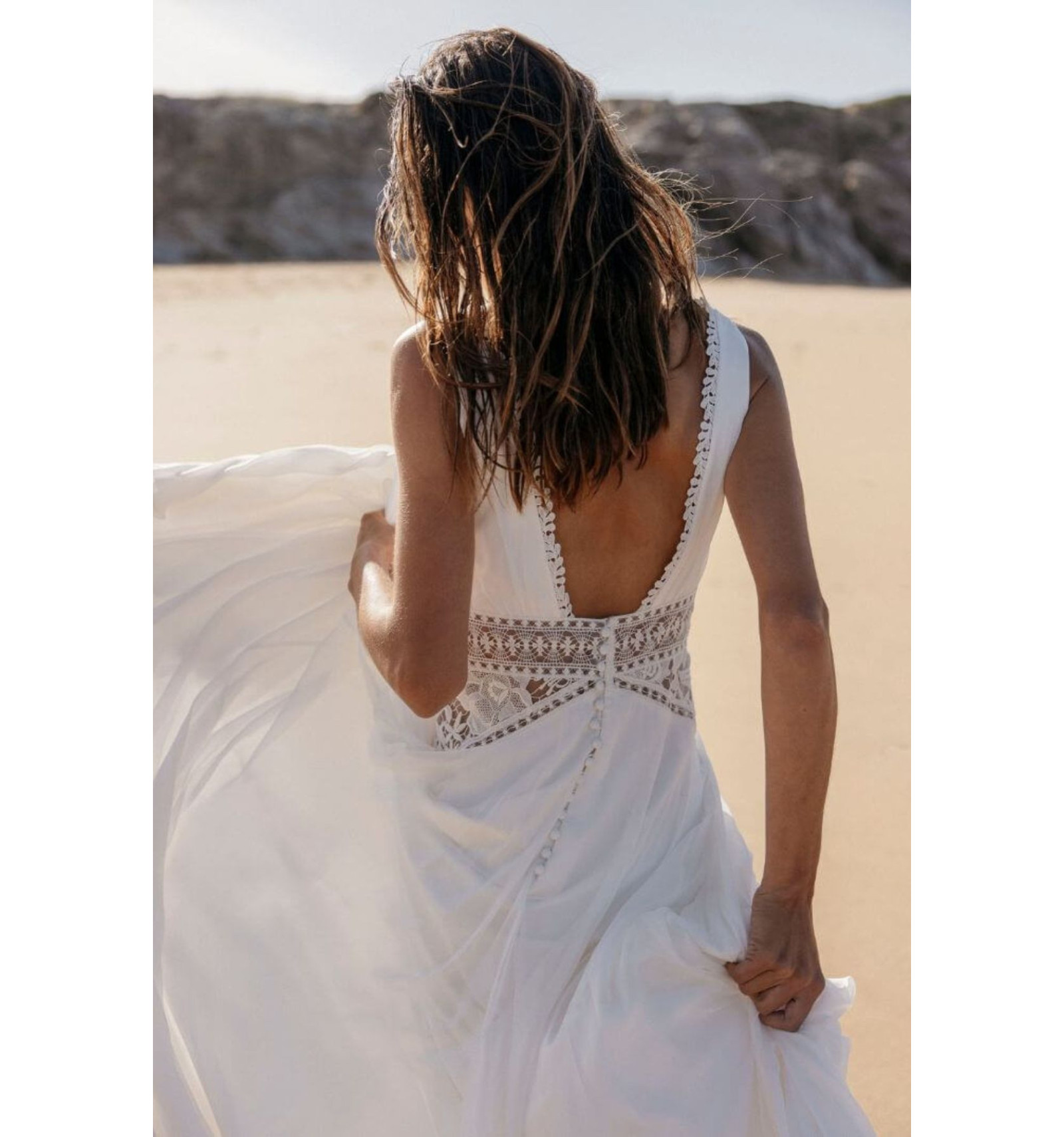 The Lorient wedding dress has a charming and subtle bohemian style. Its flowing cut enhances the bride’s figure while providing optimal comfort. Sheer Calais lace panels at the waist create a modern and romantic silhouette.