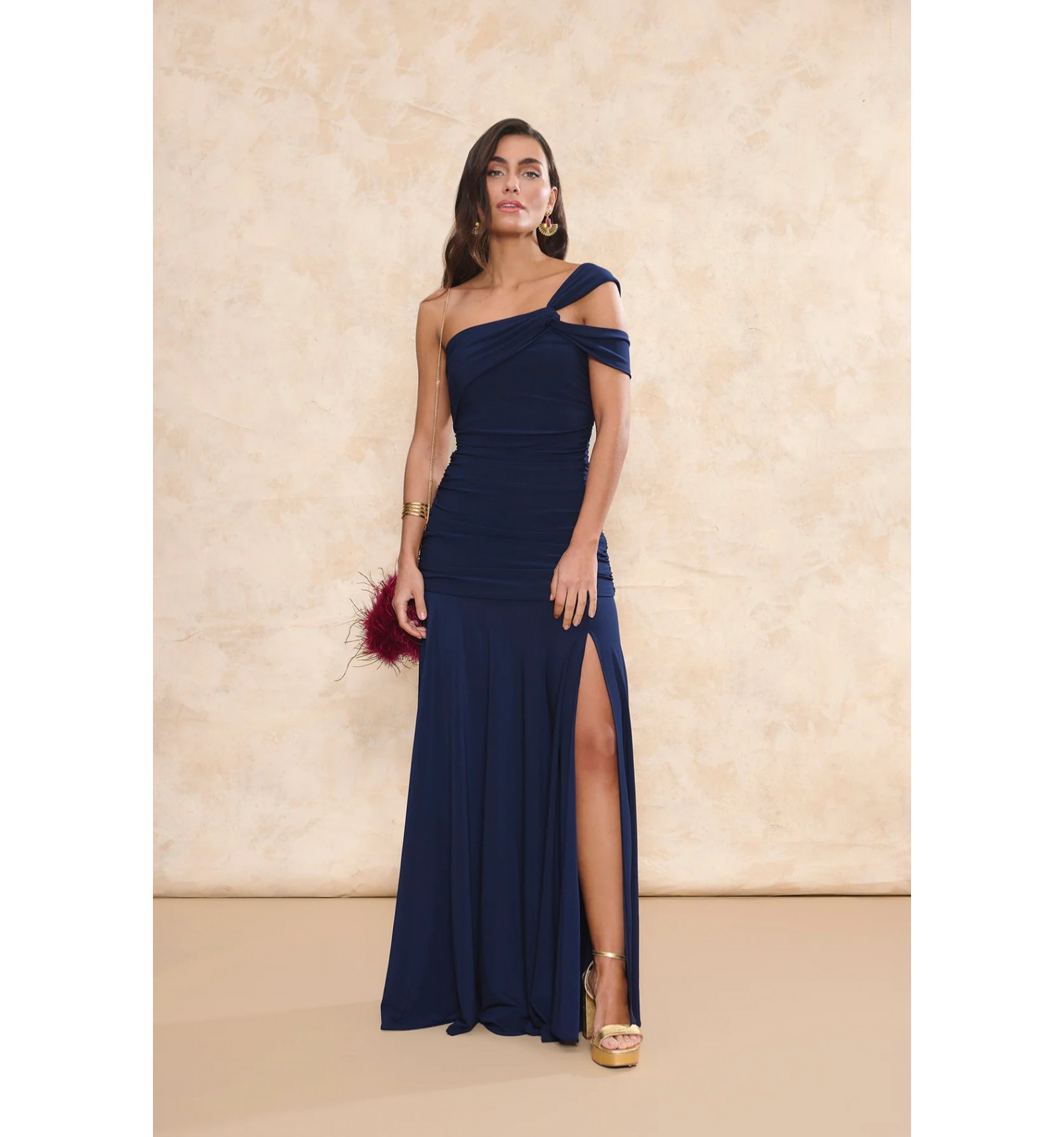 Cumbia long dress in bleu silk knit. Asymmetric neckline, double crossed straps, ruching at the hips, and a fluid skirt with a slit.
