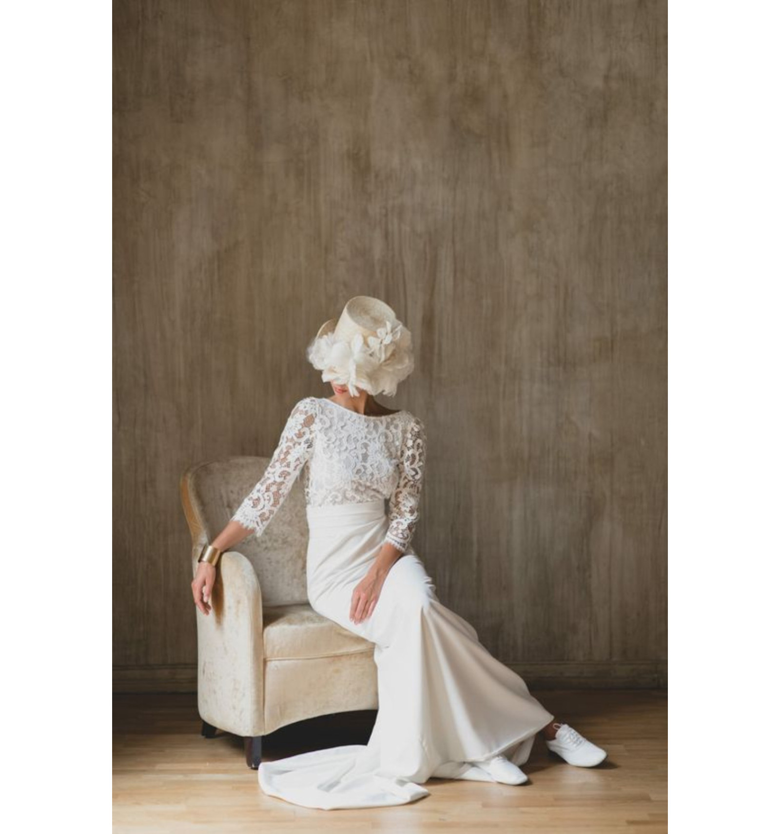 La robe de mariée Stella de Victoire Vermeulen est une robe au style haute couture affirmé. La coupe droite de la jupe suit les formes de la mariée pour les mettre en valeur. Son encolure bateau, sur un haut en guipure à manches trois-quarts lui donne une allure légèrement rétro, réhaussée par la large ceinture.