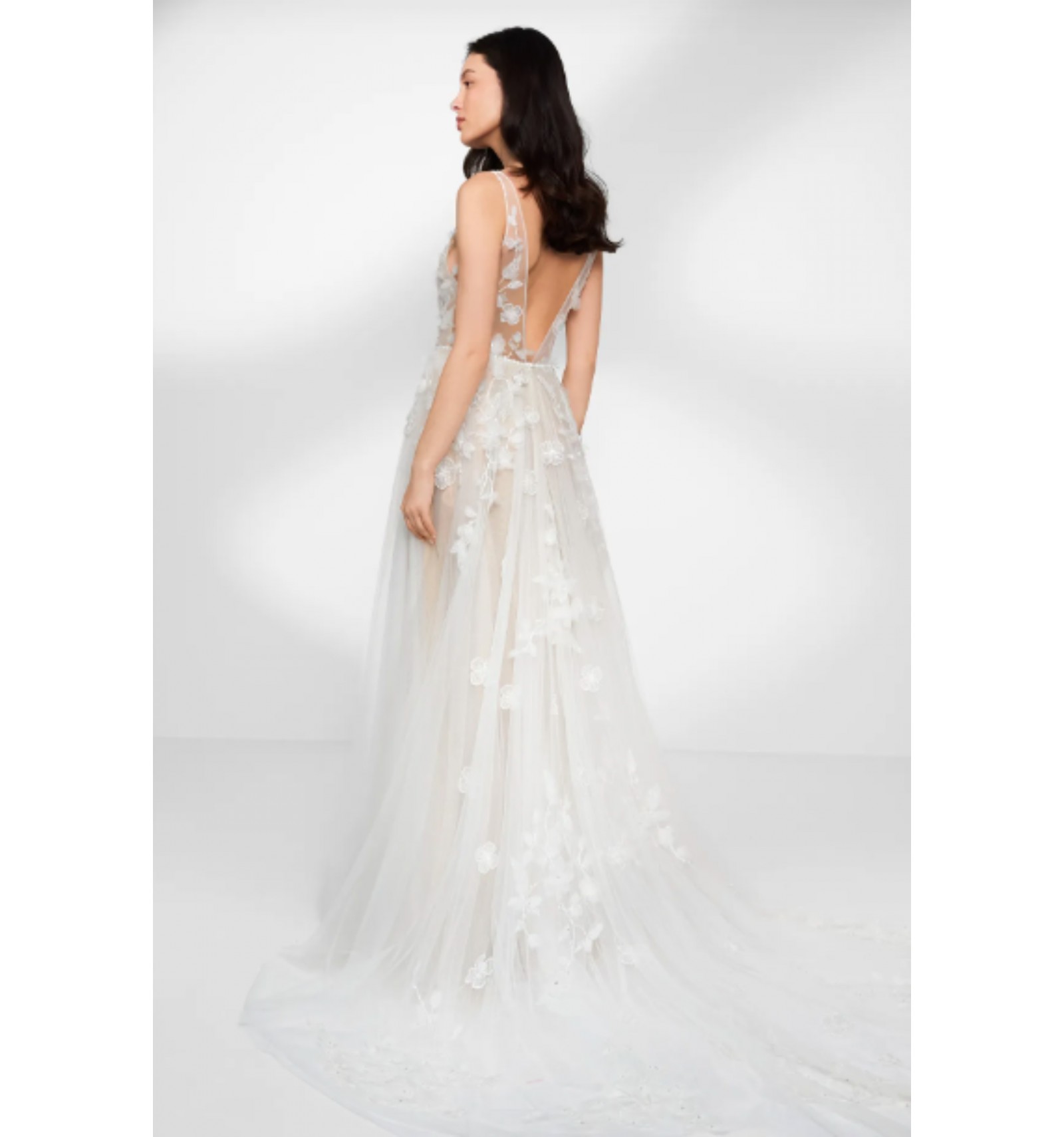 La robe Attie d’Anna Kara incarne l’élégance moderne sublimée par le savoir-faire artisanal de la créatrice. Son corsage délicatement orné de broderies en relief et de cristaux subtils souligne la féminité avec grâce, tandis que son décolleté en V et sa ceinture fine mettent en valeur la silhouette avec raffinement. Les manches fluides façon cape, ornées de motifs floraux, apportent une touche aérienne et poétique. À la fois contemporaine et intemporelle, Attie célèbre une mariée libre, romantique et lumineuse.