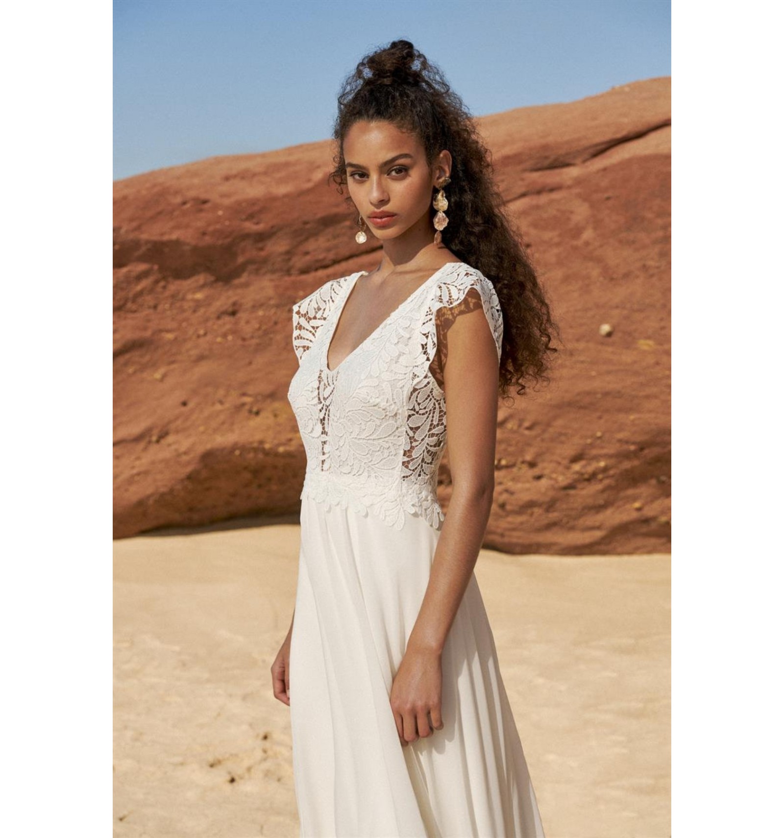 N'hésitez pas à nous solliciter pour venir essayer cette robe dans notre outlet de robes de mariée à Paris, ou pour plus d'informations si vous souhaitez l'acheter en ligne. Vous pouvez faire retoucher votre robe de mariée jusqu'à deux tailles en dessous par notre couturière. Veuillez noter que l'article vendu est une robe de mariée d'occasion ou de fin de collection. Celle-ci peut présenter quelques différences avec le modèle présenté en photo. Choisir sa robe dans notre dépôt-vente de robe de mariée, c'est faire un geste en faveur d'un mariage éco-responsable.