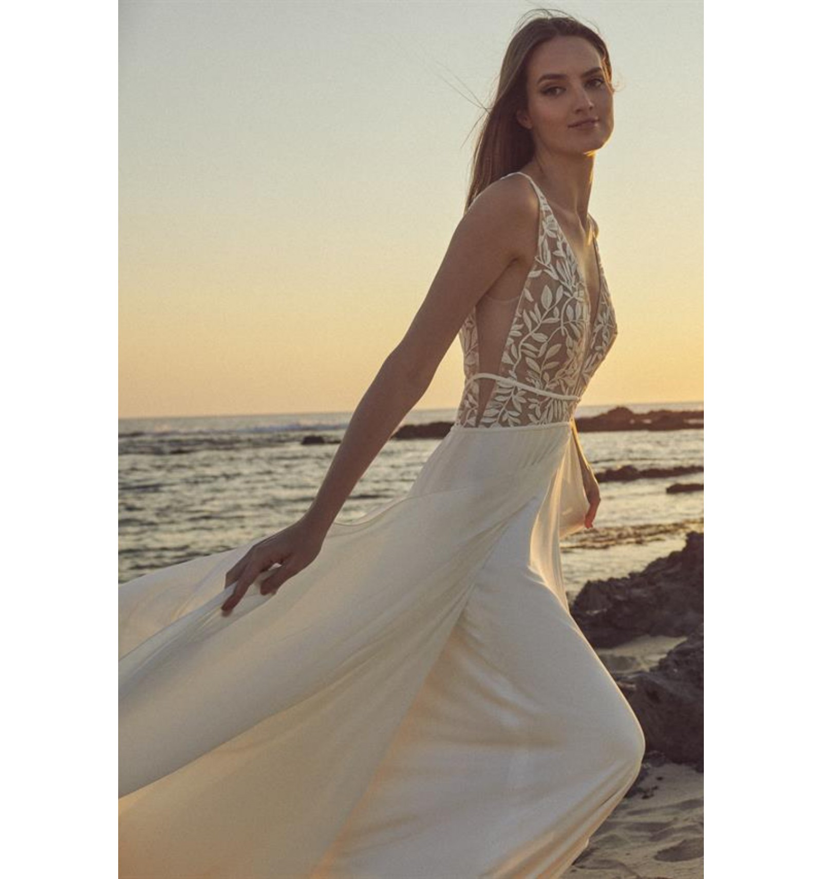 La robe Mae de Rembo Styling combine charme bohème et détail audacieux. Coup de cœur pour son haut sans manches en tulle brodé, qui dévoile un décolleté en V devant et dos, avec transparence subtile (plunge) et découpes latérales. Sa jupe fluide se termine par une traîne courte, idéale pour une allure légère et raffinée. Si vous cherchez une robe élégante, sensuelle mais facile à vivre, Mae est faite pour vous !