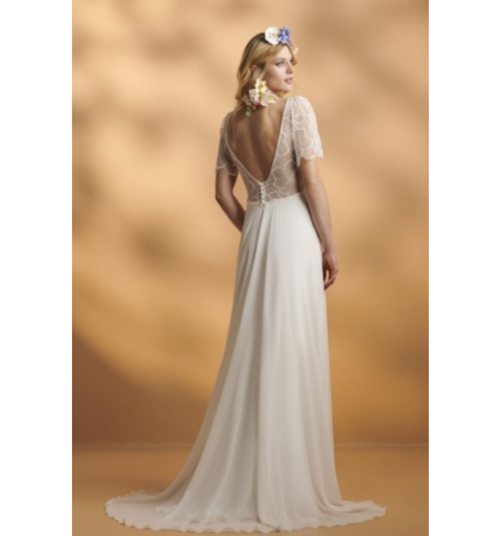 N'hésitez pas à nous solliciter pour venir essayer cette robe dans notre outlet de robes de mariée à Paris, ou pour plus d'informations si vous souhaitez l'acheter en ligne. Vous pouvez faire retoucher votre robe de mariée jusqu'à deux tailles en dessous par notre couturière. Veuillez noter que l'article vendu est une robe de mariée d'occasion ou de fin de collection. Celle-ci peut présenter quelques différences avec le modèle présenté en photo. Choisir sa robe dans notre dépôt-vente de robe de mariée, c'est faire un geste en faveur d'un mariage éco-responsable.
