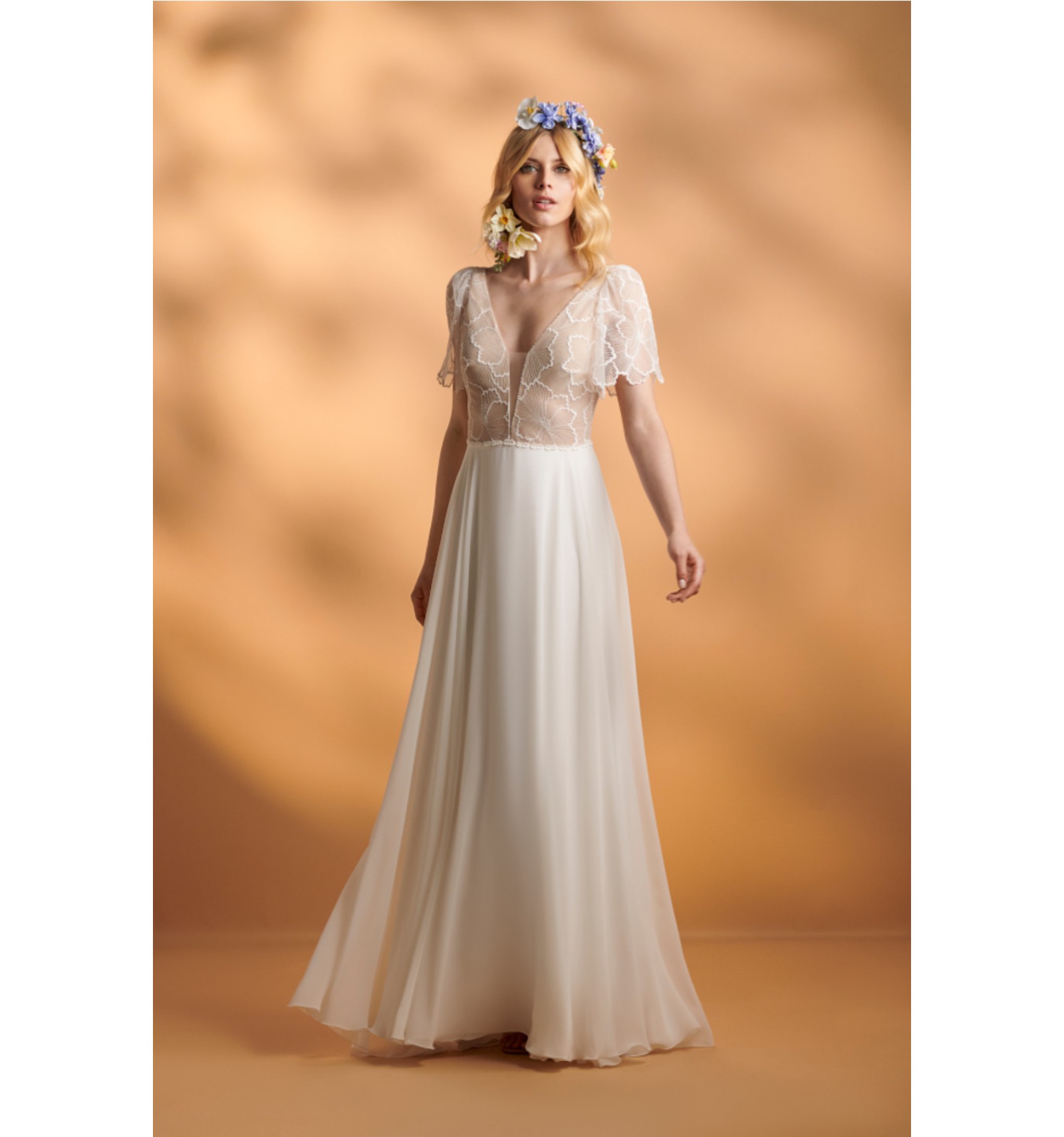 La robe Holly de Rembo Styling allie sensualité et souci du détail. Coup de cœur pour son corsage en tulle ivoire brodé, ses manches courtes transparentes et son dos ouvert audacieux, le tout rehaussé par un profond décolleté plongeant avec insert transparent central. Sa jupe en mousseline fluide est agrémentée d’une fente latérale et d’une petite traîne gracieuse. Si vous voulez une robe raffinée, moderne et pleine de personnalité, Holly est faite pour vous !