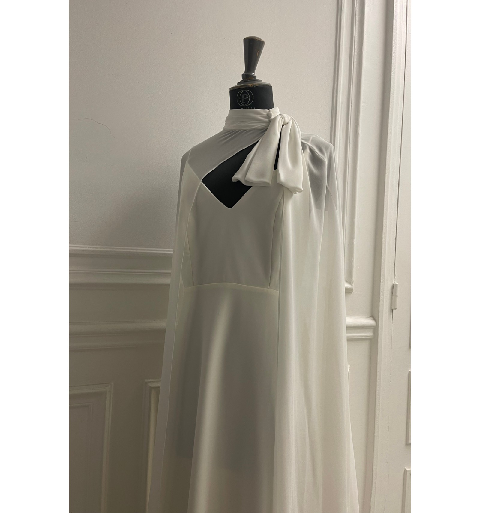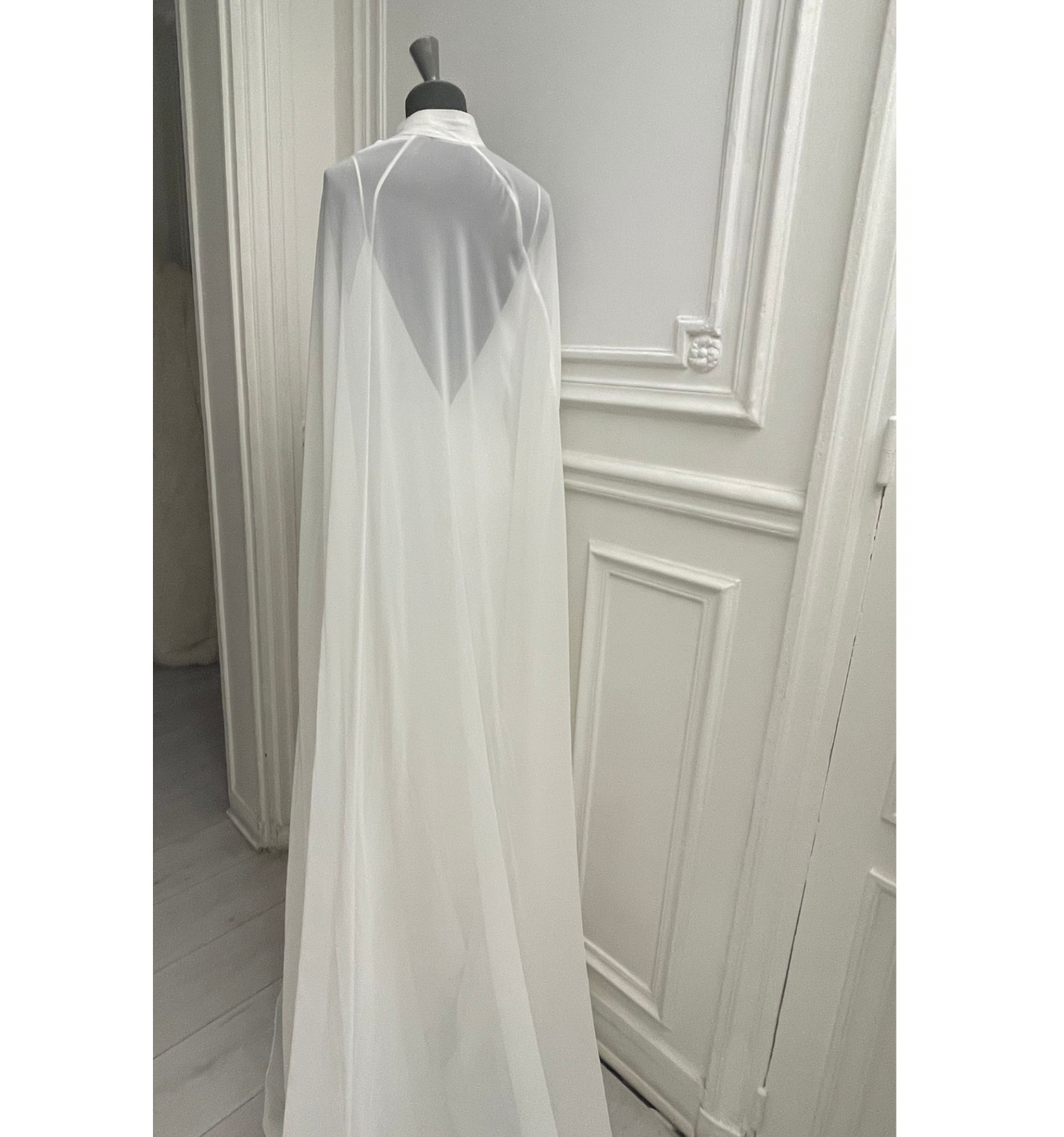 La cape Victoria d’Alma Novia apporte une touche de raffinement et de douceur à la tenue de mariée. Son col délicat se ferme grâce à un joli nœud sur le côté, orné de petits boutons pour une finition élégante et féminine.