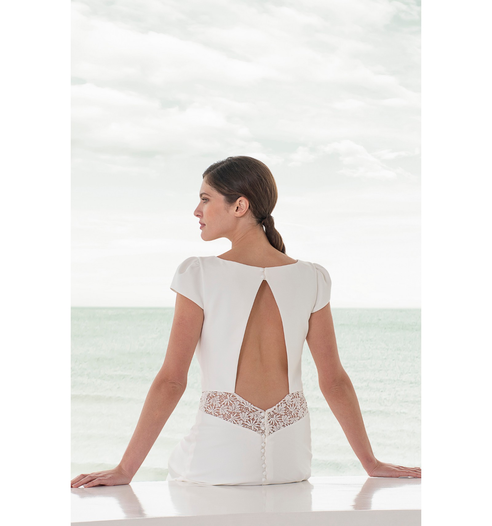 La robe Nice de Lambert Création incarne la délicatesse et la modernité d’une mariée au style naturel et raffiné. Confectionnée en crêpe léger, elle offre une ligne fluide et élégante qui sublime la silhouette avec simplicité. Son haut en dentelle délicatement ajourée apporte une touche romantique, tandis que son dos nu orné de boutons recouverts dévoile une féminité subtile et assumée. La jupe évasée accompagne chaque mouvement avec grâce, pour une allure à la fois douce et contemporaine.