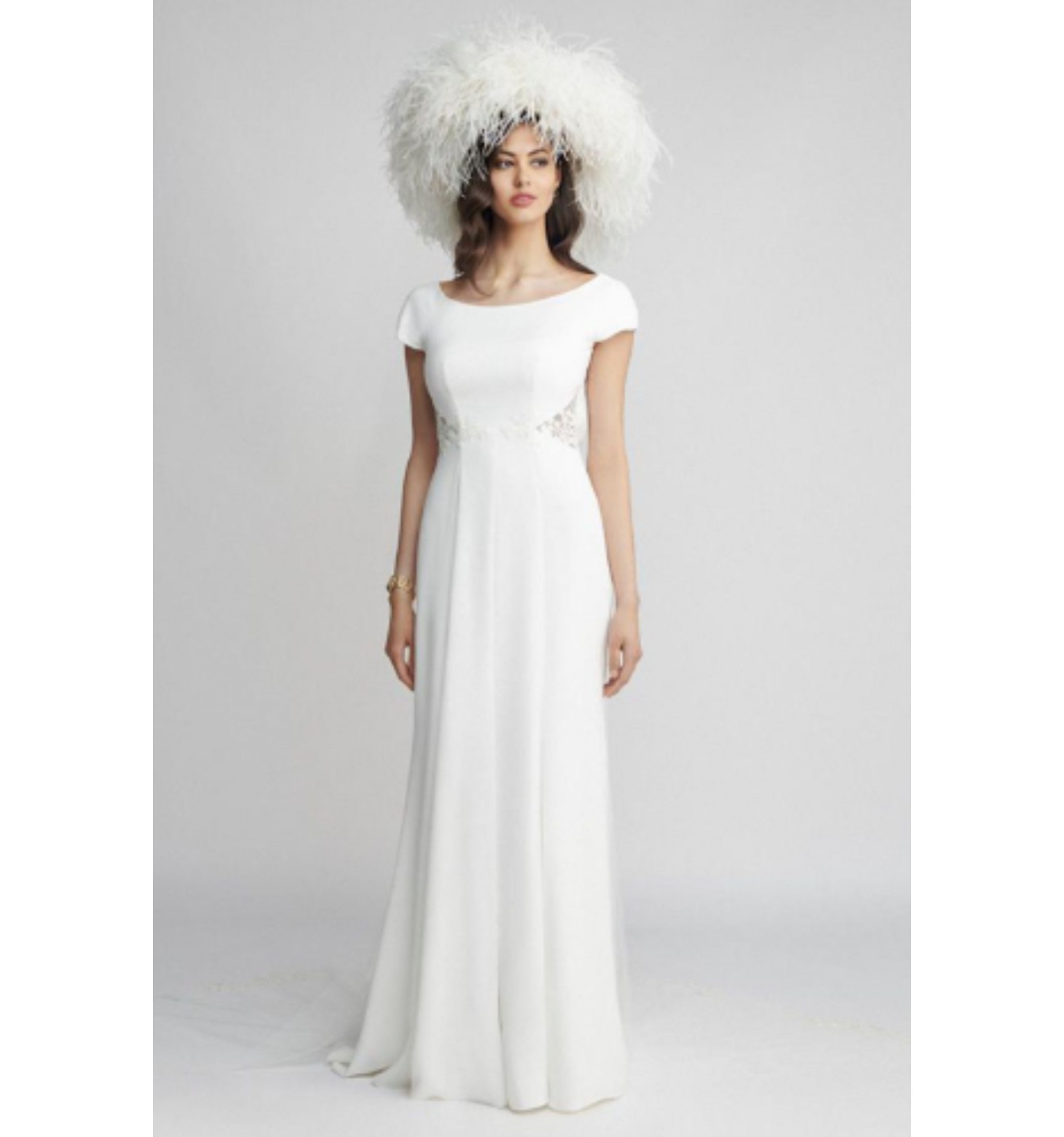 La robe présente une coupe élégante et épurée, avec un haut à encolure bateau et de petites manches qui apportent une touche douce et féminine. Des incrustations de dentelle délicate viennent souligner la taille, créant un effet graphique subtil et très raffiné. La jupe longue et fluide allonge la silhouette avec naturel, offrant une allure à la fois moderne et intemporelle. L’ensemble dégage une sophistication minimaliste, parfaite pour une mariée chic au style sobre et affirmé.