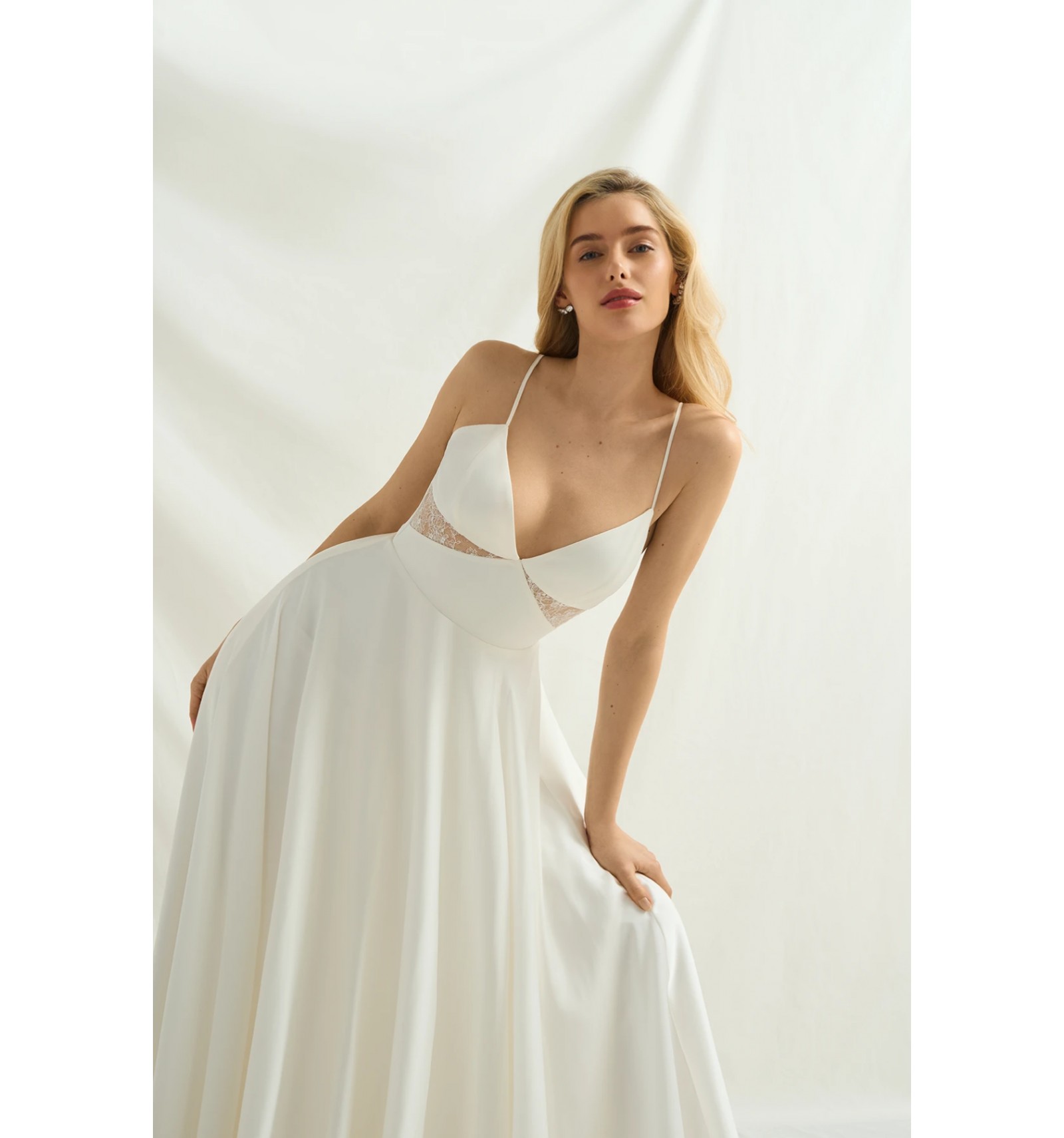 Robe en crêpe fluide, de ligne épurée avec une jupe légère et aérienne. Le buste est structuré par un profond décolleté en V souligné de fines bretelles. Des empiècements de dentelle délicate viennent habiller la taille sur les côtés, apportant une touche de transparence subtile. Le dos est dégagé pour une allure féminine et moderne.