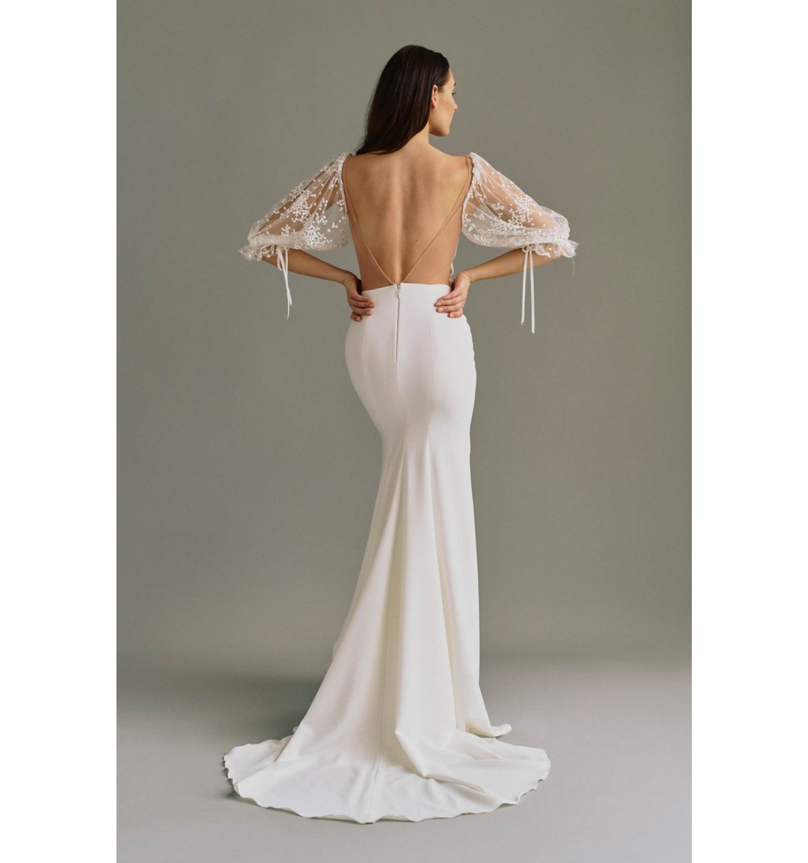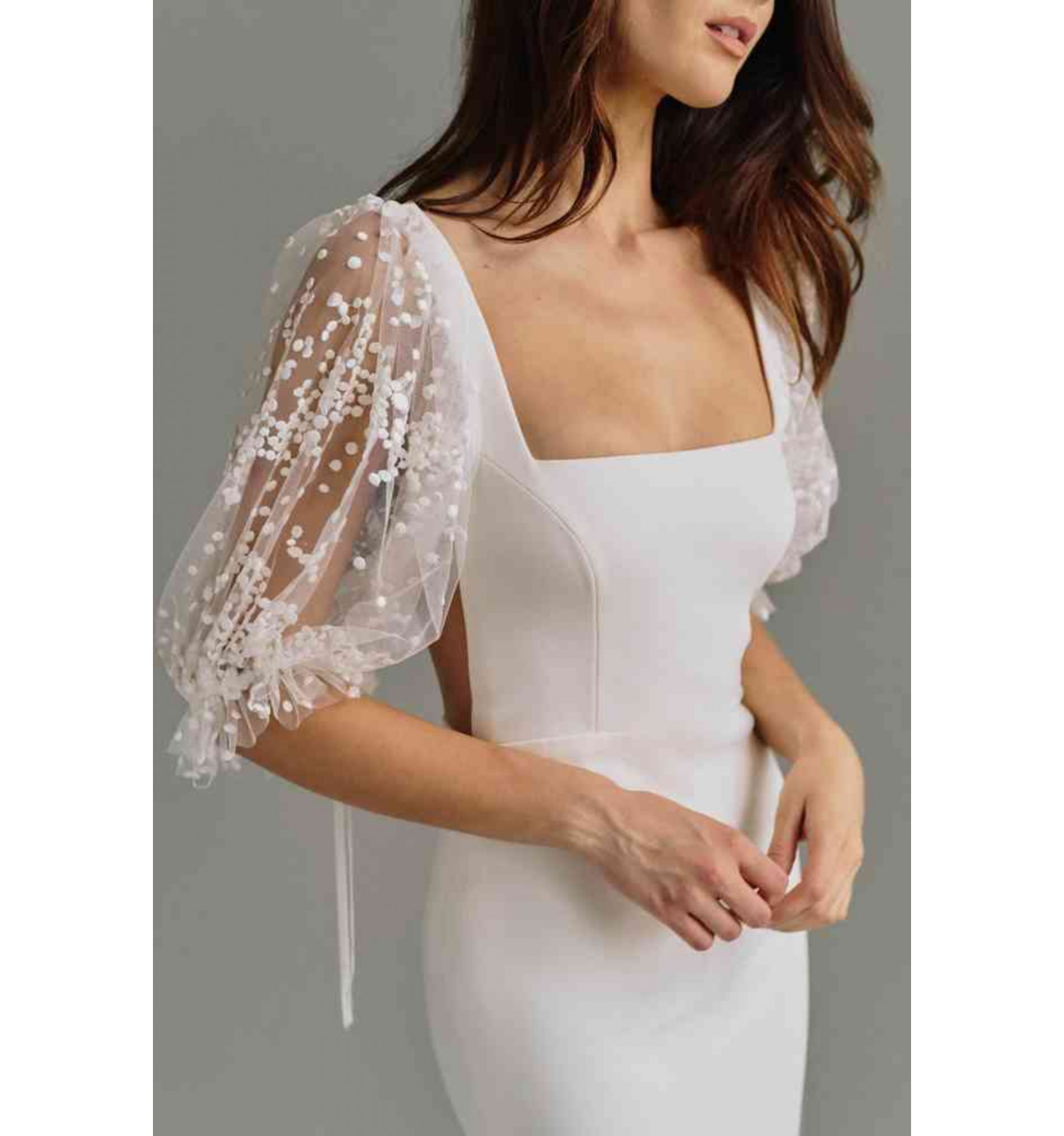 Robe Florence signée Laudae, confectionnée en crêpe élégant et extensible avec des coutures princesses flatteuses pour une silhouette raffinée. Elle présente un décolleté droit structuré, des manches bouffantes avec dentelle à pois brodéeet une jupe moderne intégrant des empiècements de dentelle subtilement placés qui créent un effet « peekaboo » dans la jupe. Les manches sont maintenues près du coude par un fin ruban gros-grain, et l’arrière du modèle est mis en valeur par un dos dégagé pour une finition sophistiquée et contemporaine.