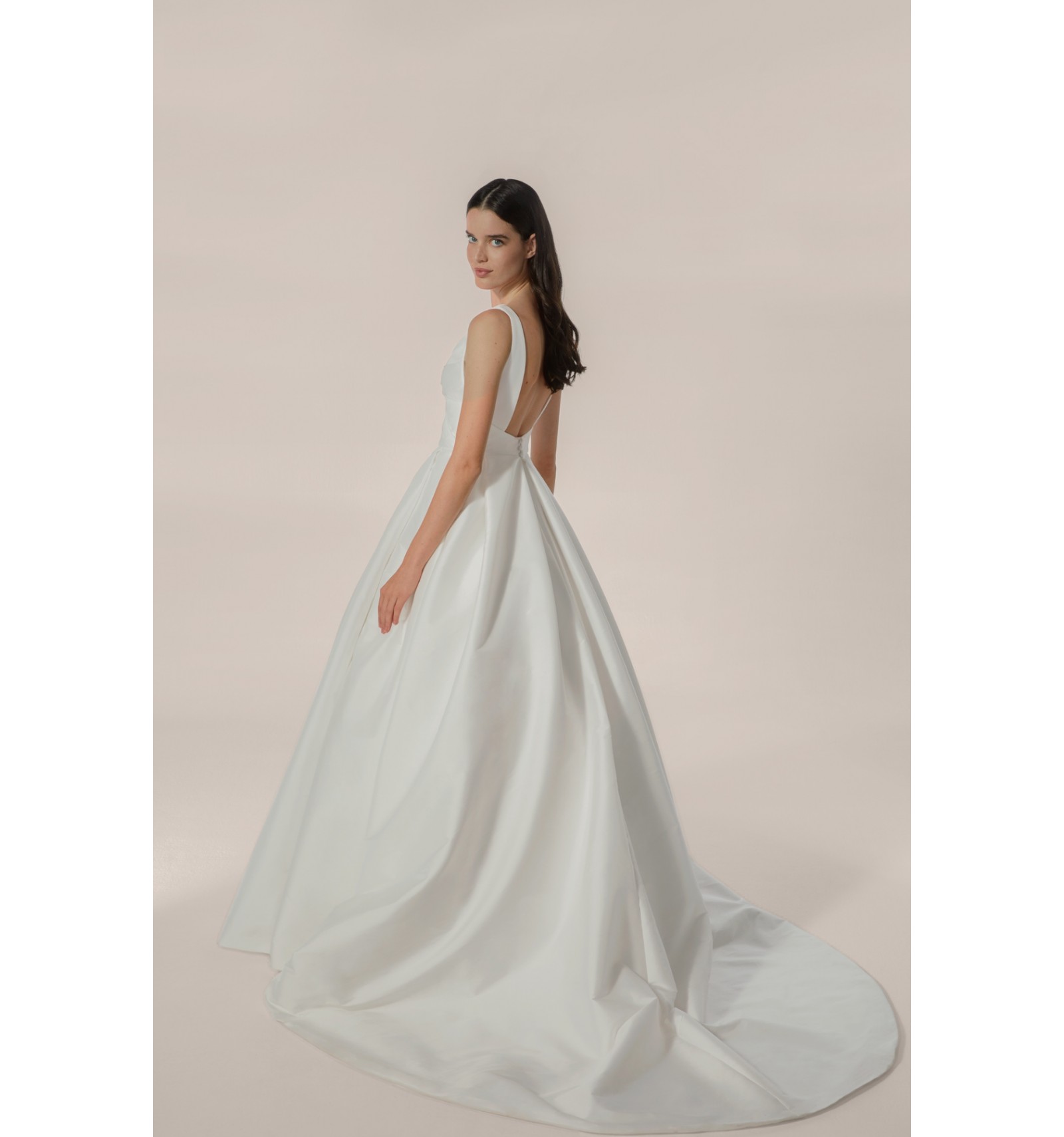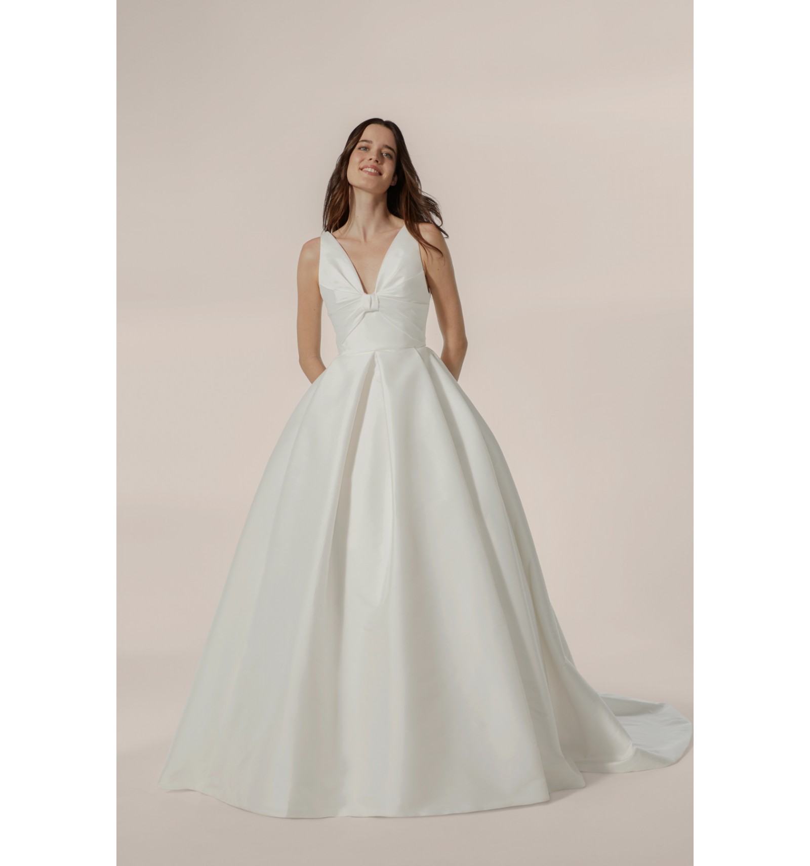 La robe 2635 de Jesus Peiro est une création pleine de charme, réalisée en mikado taffeta avec une jupe ample et romantique à l’allure de princesse. Le corsage est délicatement structuré et orné d’un détail nœud sur le buste, apportant une touche ludique et féminine. Les larges bretelles offrent confort et maintien, tandis qu’un dos carré ouvertsouligne l’allure moderne et sophistiquée de cette robe élégante.