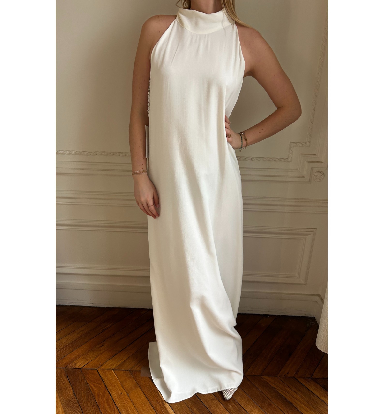 Cette robe de Victoire Vermeulen se distingue par sa coupe longue et fluide, à l’allure minimaliste et élégante. Le col montant apporte une touche moderne et sophistiquée, tandis que le dos est sublimé par un pan de tissu délicatement drapé. La ligne droite et épurée met en valeur la silhouette sans contrainte. Le tissu ivoire, doux et léger, offre un tombé naturel et très raffiné.