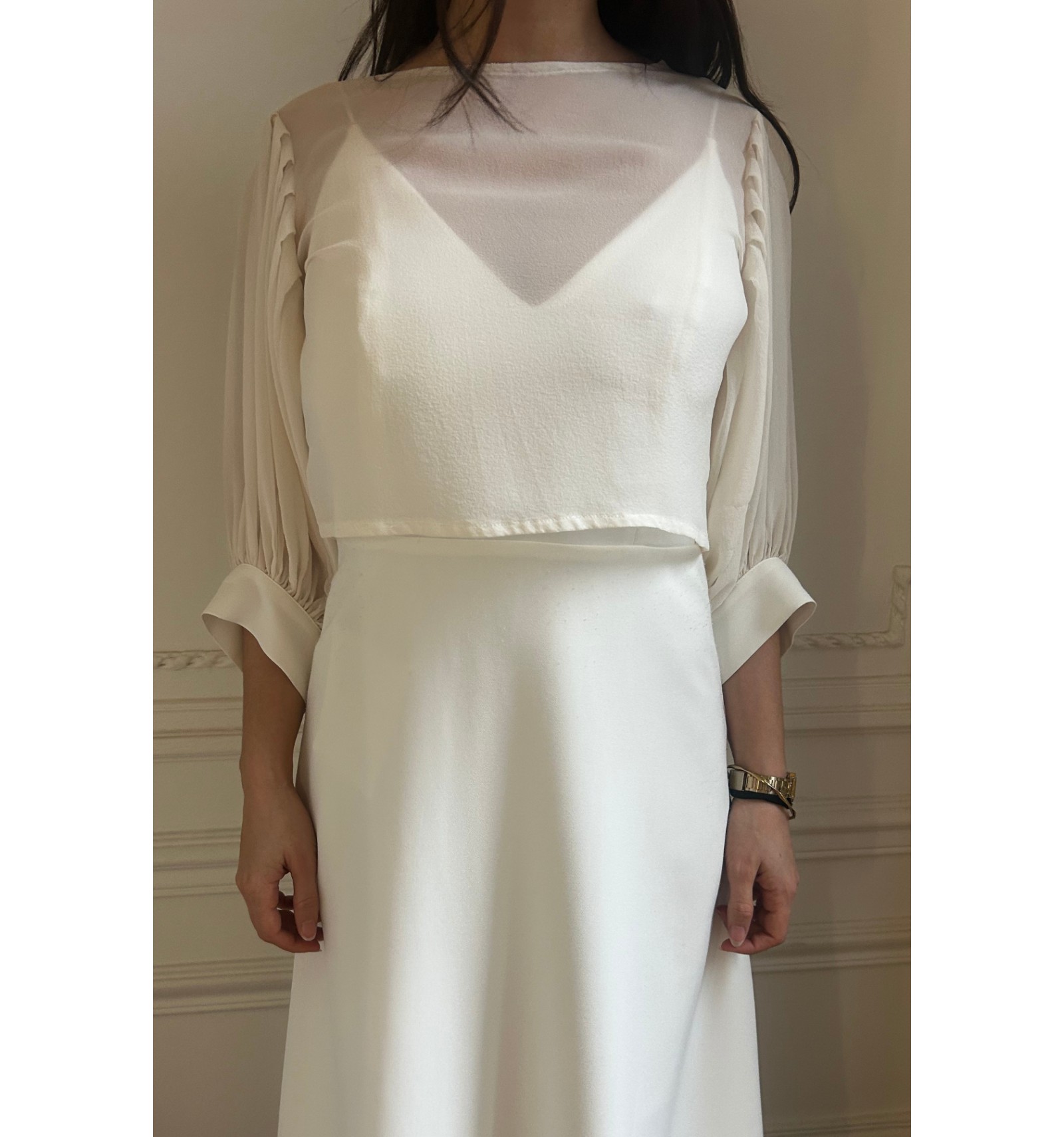 Top de mariée signé Victoire Vermeulen, au style délicat et raffiné. Confectionné dans un tissu transparent, il présente de jolies manches bouffantes avec de subtils plis, apportant légèreté et mouvement. L’arrière se ferme par de petits boutons et dévoile un magnifique dos nu, pour un effet à la fois romantique et moderne.