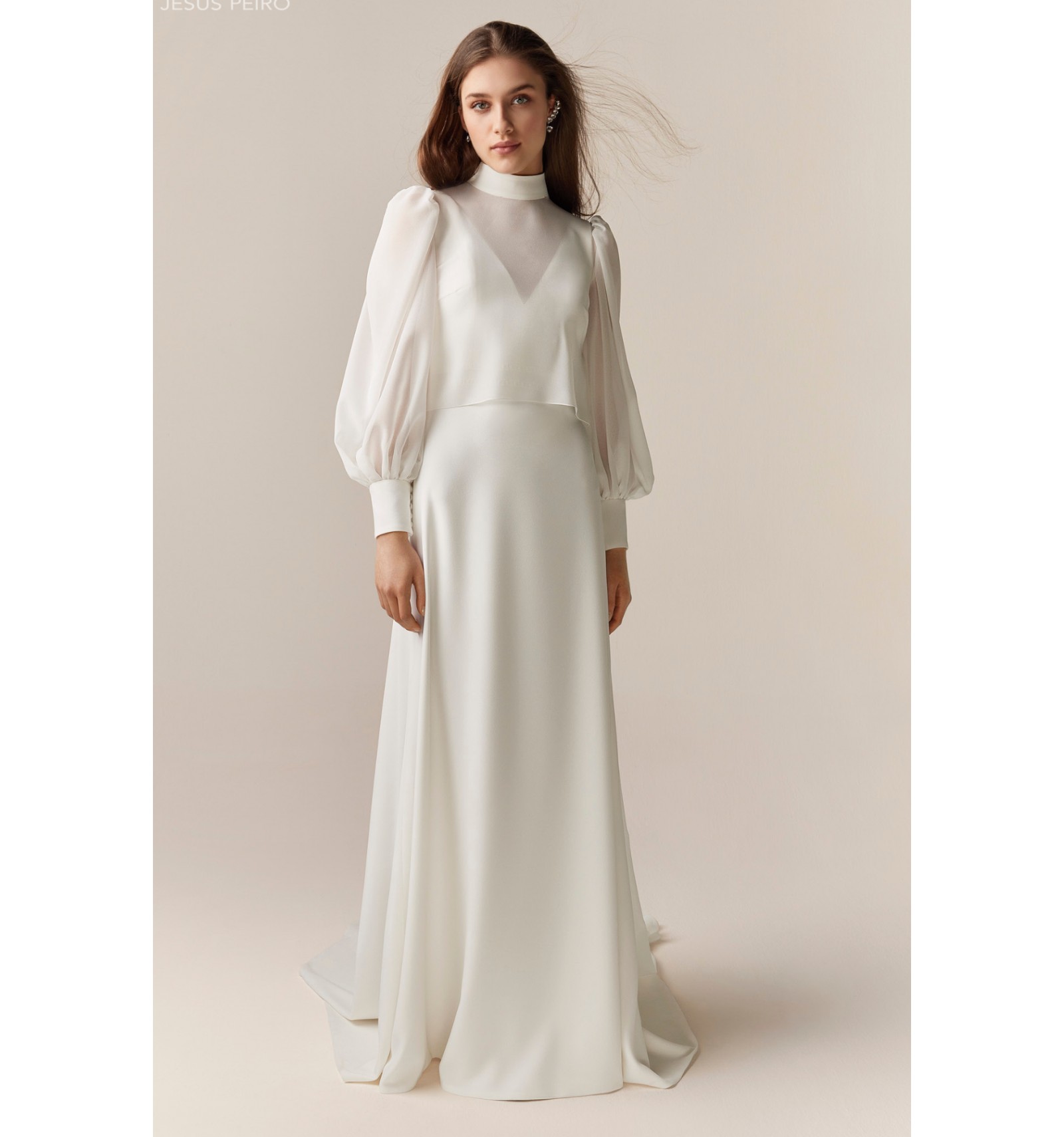 Robe de mariée au style élégant et contemporain signée Jesús Peiró. Le modèle 2566 séduit par ses lignes épurées et sa coupe structurée, offrant une allure à la fois moderne et intemporelle. Une création raffinée, idéale pour une mariée en quête de sobriété et d’élégance.