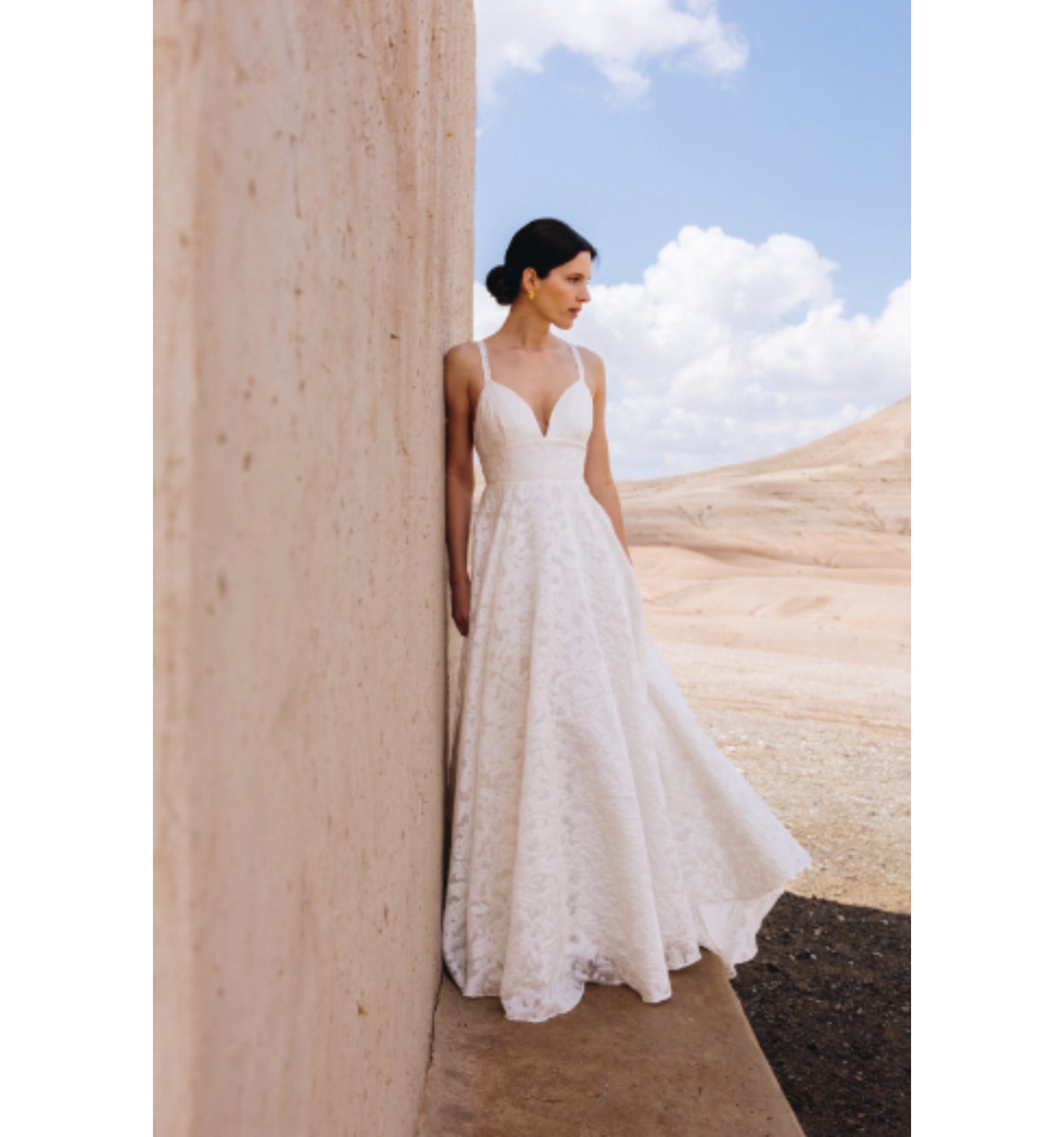 Son buste délicat se pare d’un décolleté plongeant et de fines bretelles, contrebalancés par un dos carré structuré. Une large ceinture vient souligner la taille avec élégance. Sa jupe ample et vaporeuse est confectionnée dans un jacquard exclusif, créé sur mesure avec un façonnier français. Fluide comme une mousseline, ce tissu léger est orné d’un subtil motif de boutons de roses, tissés dans la masse.
