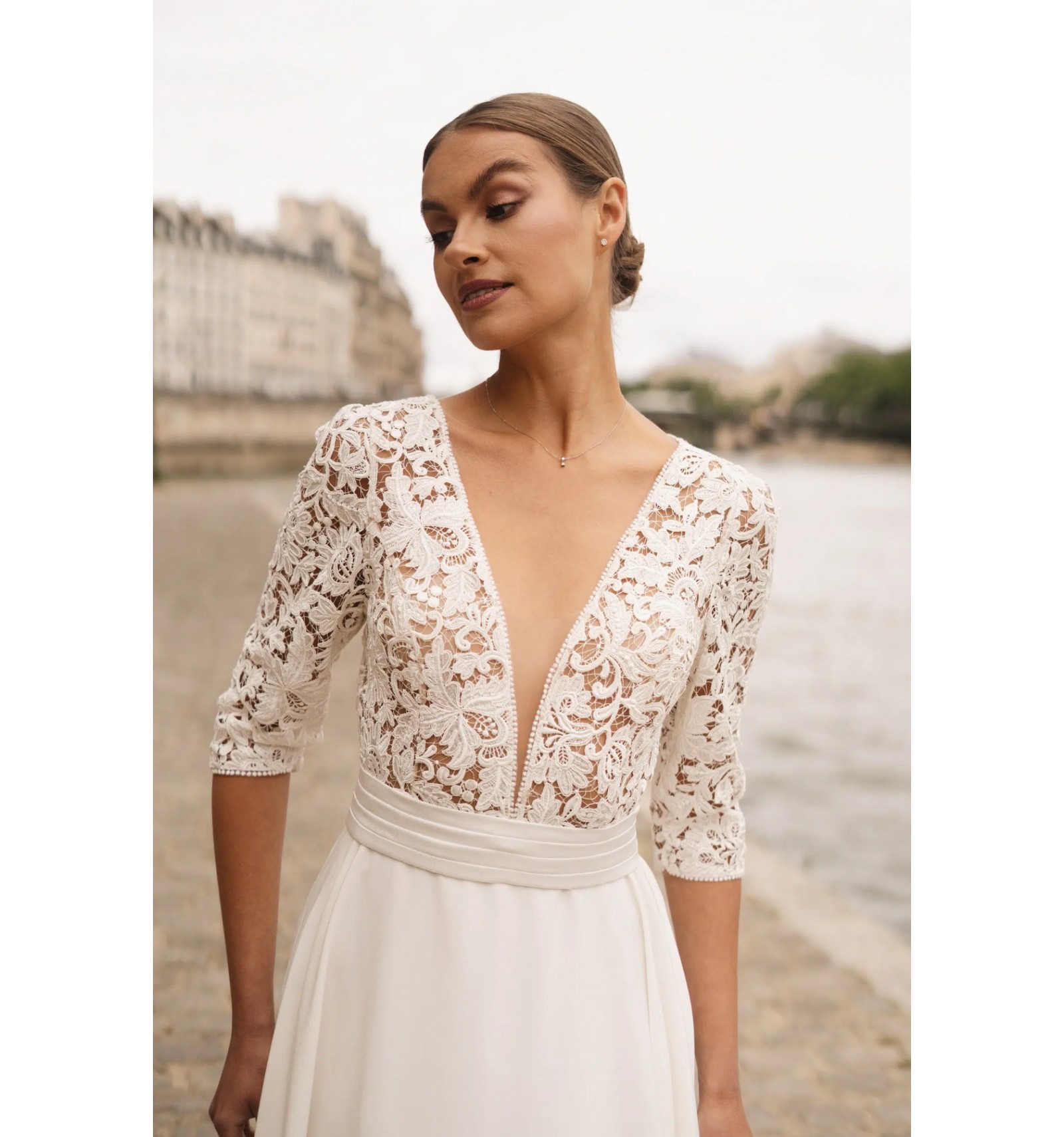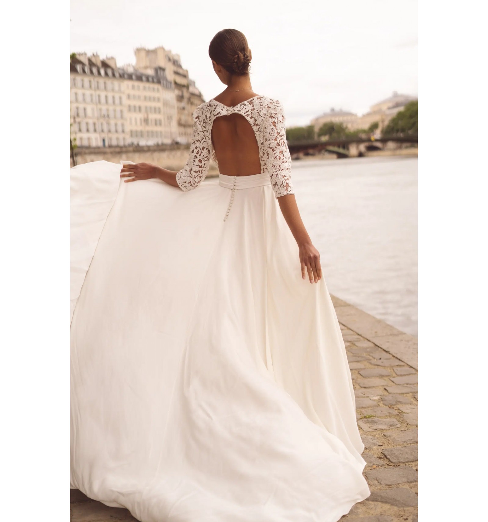 N'hésitez pas à nous solliciter pour venir essayer cette robe dans notre outlet de robes de mariée à Paris, ou pour plus d'informations si vous souhaitez l'acheter en ligne. Vous pouvez faire retoucher votre robe de mariée jusqu'à deux tailles en dessous par notre couturière.