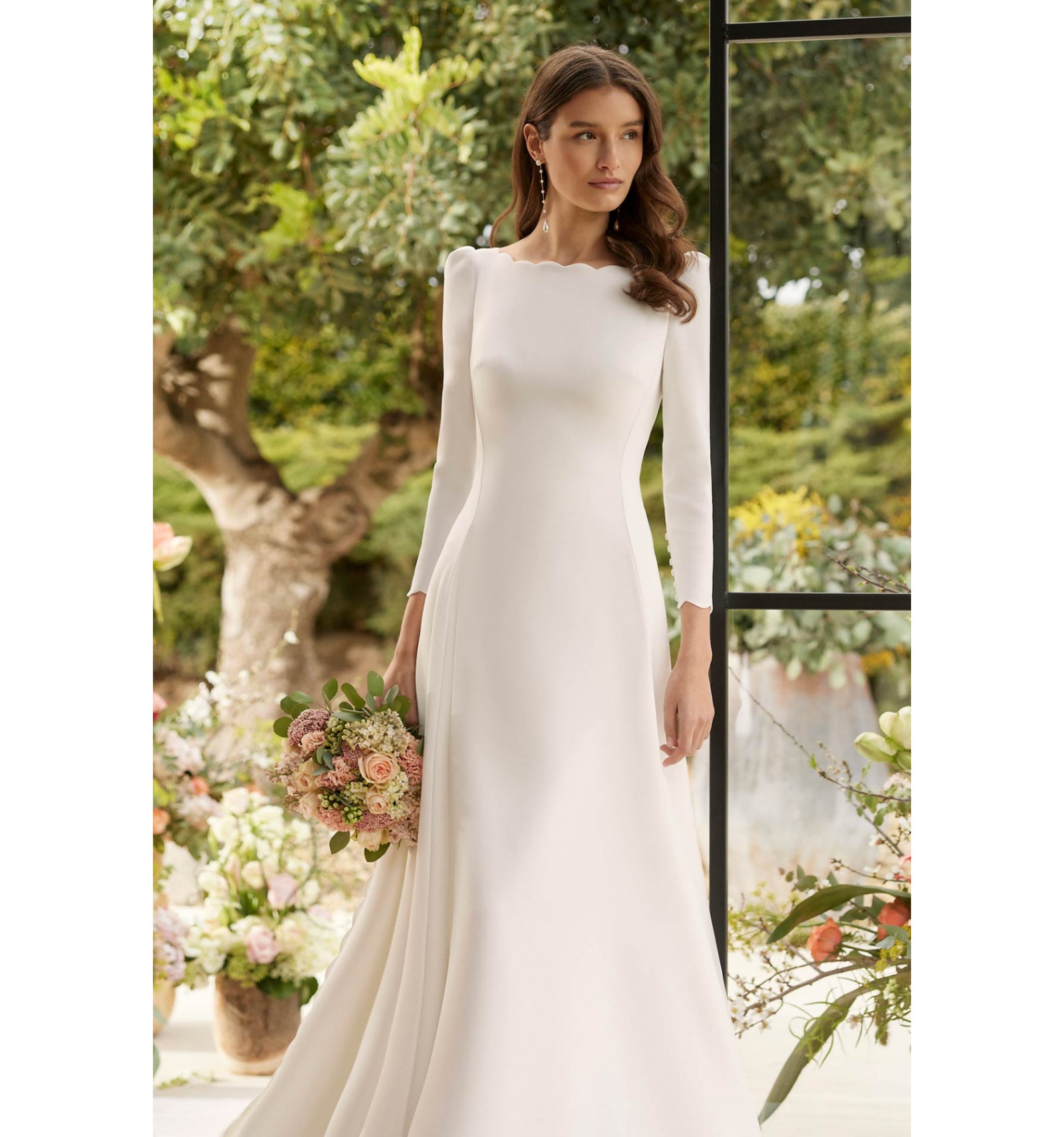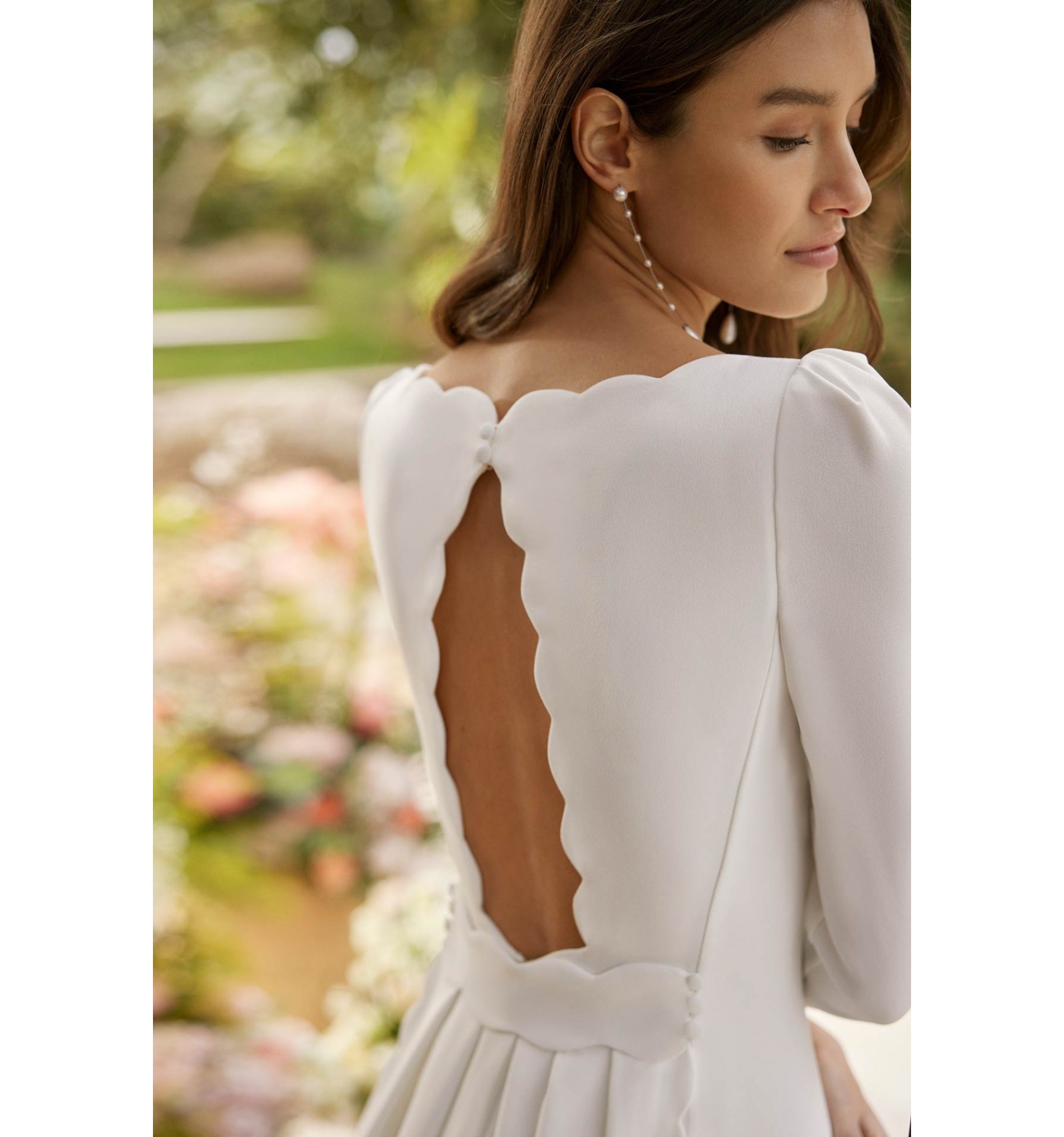 Son décolleté délicatement travaillé met en valeur le buste avec finesse, tandis que le dos apporte une note de caractère et de sophistication. Chaque détail est pensé pour révéler votre féminité tout en conservant cette aura classique propre aux créations Rosa Clará.