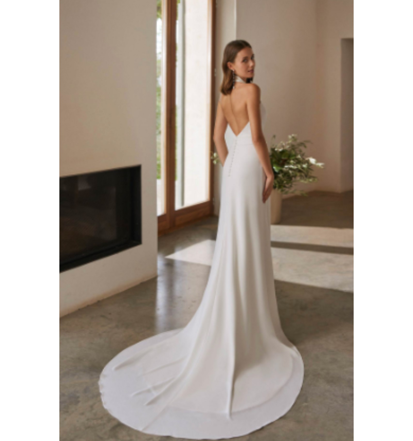 La robe Narela de la marque Alma Novia est une robe de mariée longue en crêpe au style minimaliste et élégant. Elle se distingue par son col américain (halter) qui met en valeur les épaules et son dos largement ouvert très féminin.