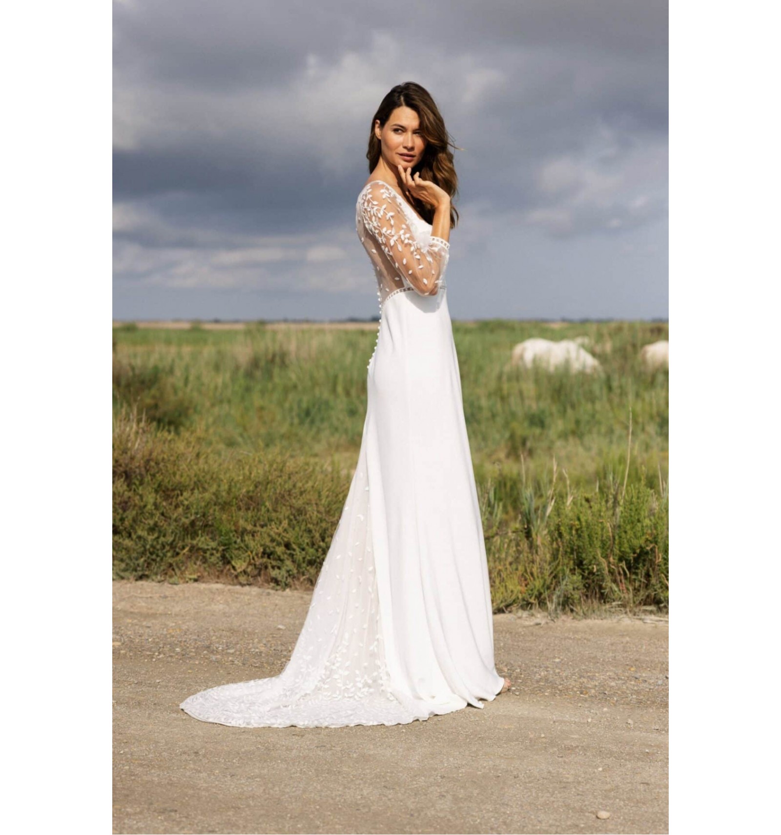 Veuillez noter que l'article vendu est une robe de mariée d'occasion ou de fin de collection. Celle-ci peut présenter quelques différences avec le modèle présenté en photo. Choisir sa robe dans notre dépot-vente de robe de mariée, c'est faire une geste en faveur d'un mariage éco-responsable.