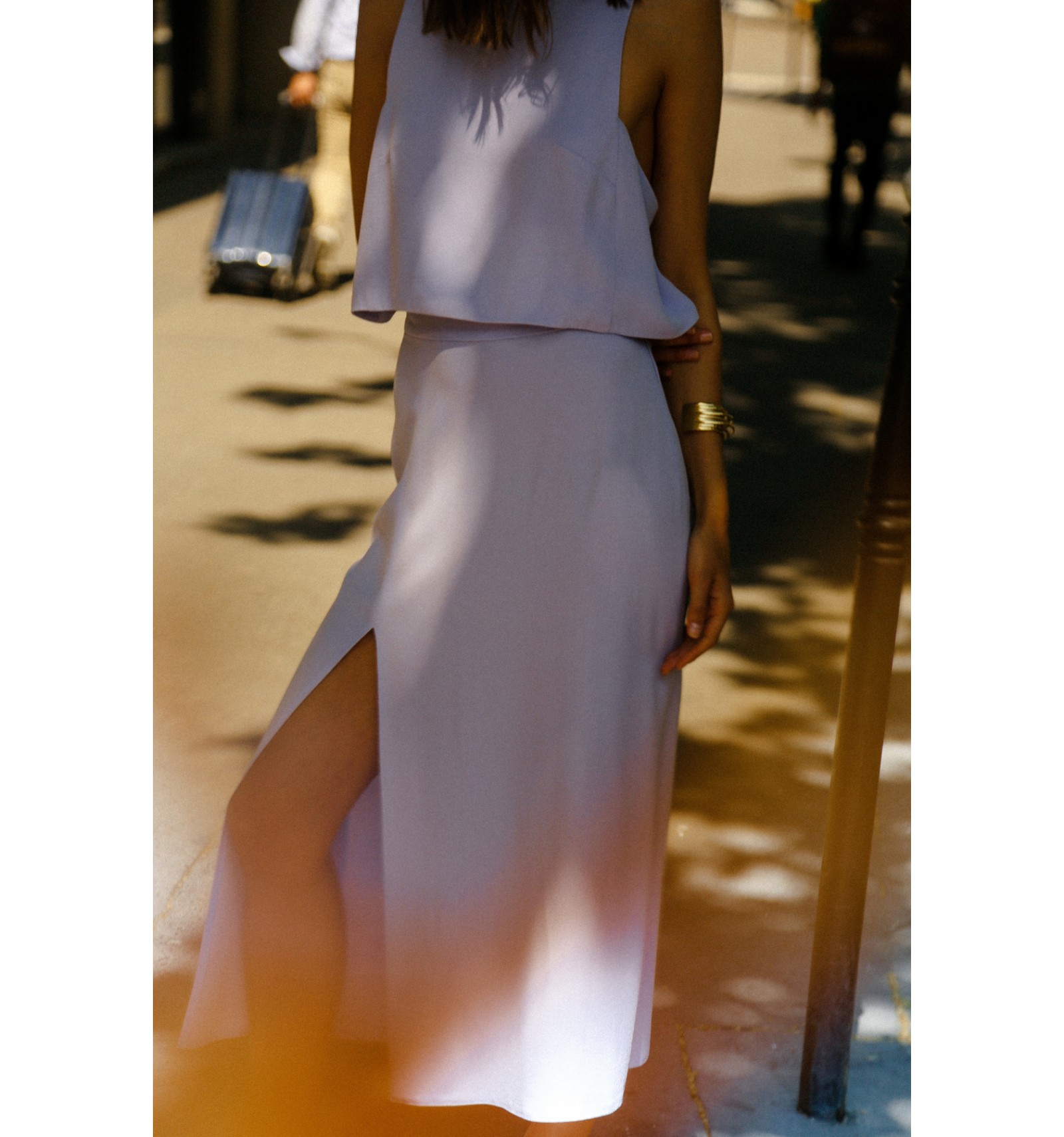 La jupe s’associe parfaitement avec le top Ferret prune pour créer une tenue lumineuse et élégante, parfaite pour le mariage de vos proches.