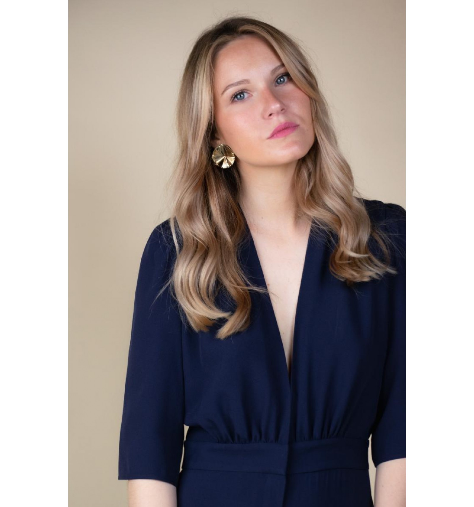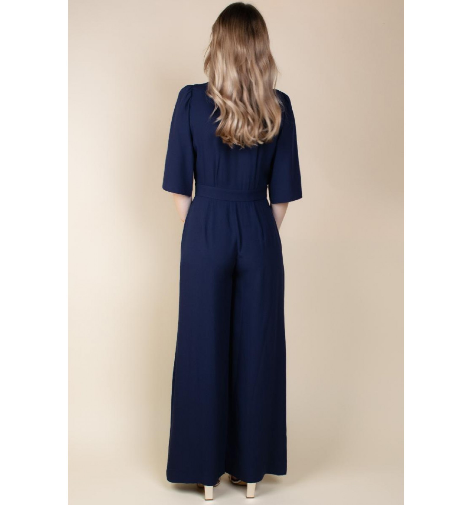 Silhouette moderne et féminine, marquée à la taille et sublimée par des jambes amples. Une ouverture discrète dans le dos apporte fluidité et liberté de mouvement. Confectionnée dans une matière souple et gainante, elle offre un confort absolu au quotidien. Son décolleté en V plongeant est délicatement fermé par une fine agrafe dorée.