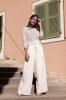 Certaines d’entre vous ont besoin de pouvoir bouger, et surtout, de garder un confort maximum. Le choix d’une combinaison pantalon sera alors une option idéale, qui a l’avantage de s’adapter à la grande majorité des styles et des morphologies. Récemment, la tendance est à la combinaison évasée, de style palazzo. Ce style de combinaison souligne la taille grâce à sa taille haute, et tombe de gracieusement sur les hanches. Cette coupe fluide a l’avantage de camoufler les petits défauts, et la combinaison est parfaite pour un mariage civil moderne. Côté haut, vous avez plusieurs options. Vous pouvez parfaitement choisir un haut en dentelle comme un haut simple, ou bien un décolleté sur le devant comme un bustier. Vous pouvez même rajouter une traine pour un effet plus dramatique !
