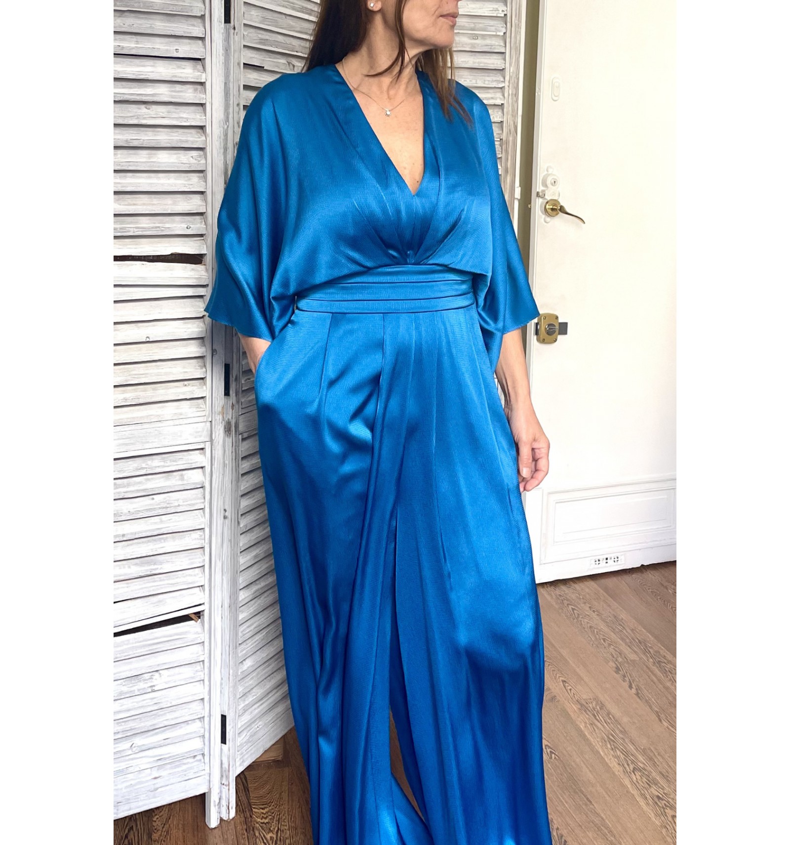 Combinaison de gala longue, de style boho chic et confectionnée en satin. Elle affiche un décolleté en V et est ornée d’un nœud dans le dos. Des manches papillons complète le look.