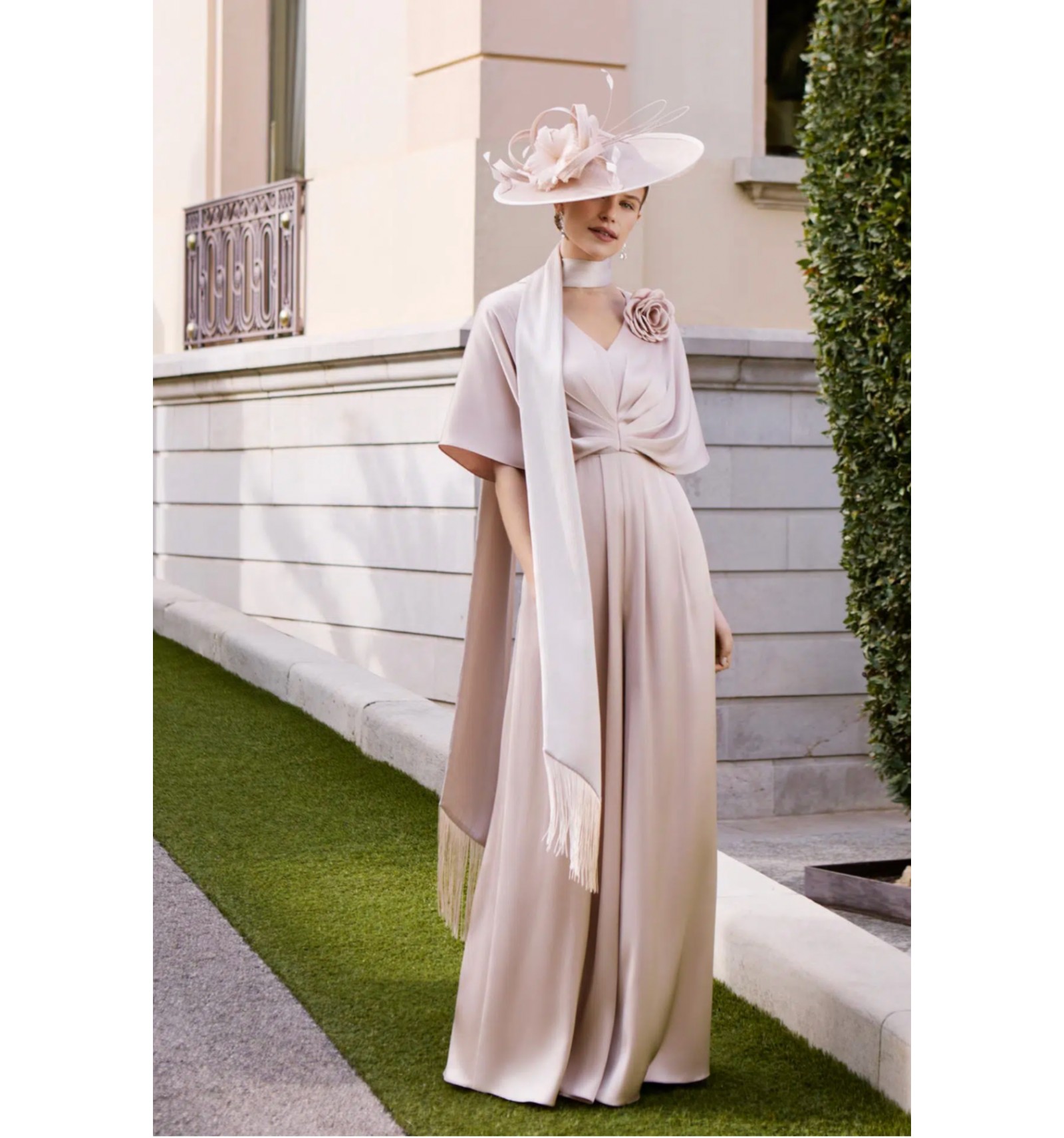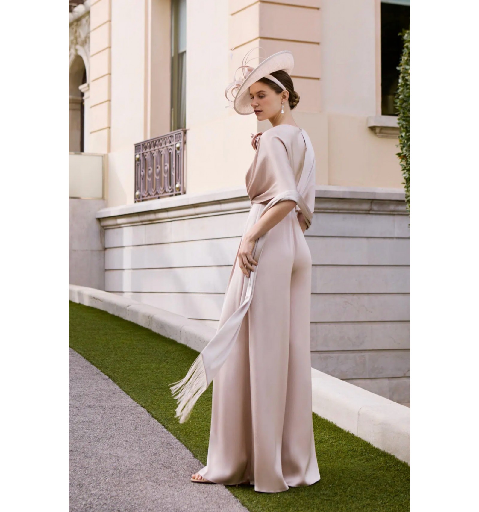 Combinaison de gala longue, de style boho chic et confectionnée en satin rose. Elle affiche un décolleté en V, une ceinture pour marquer la taille et un pantalon large. Des manches papillons ainsi qu'une jolie étole complète le look.